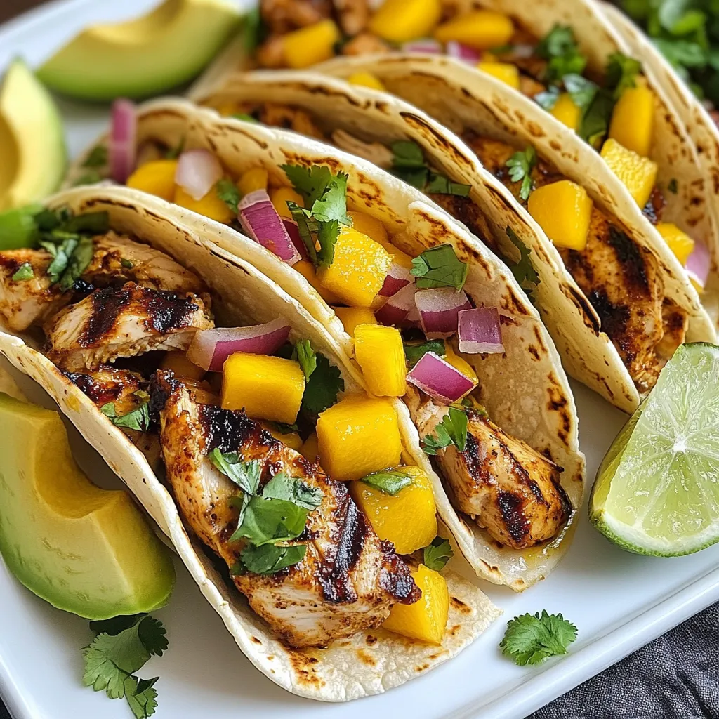 Delicious tacos filled with spicy jerk chicken, fresh mango, and avocado.