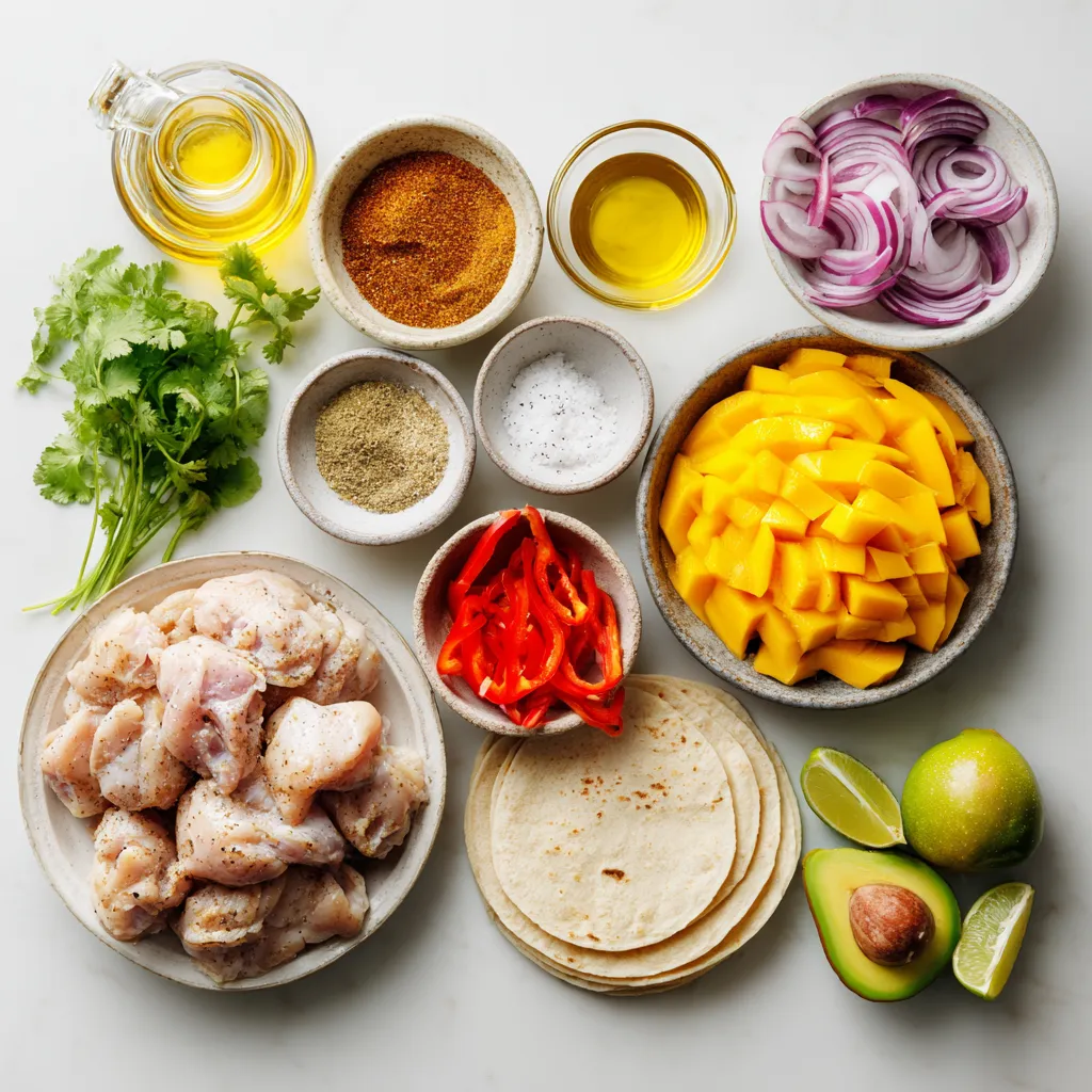 The main ingredients form the heart of our tacos. Chicken thighs give a rich, juicy flavor. Jamaican jerk seasoning adds a spicy kick. Fresh produce like mango, red onion, and red bell pepper adds crunch and sweetness. Finally, corn tortillas hold everything together.