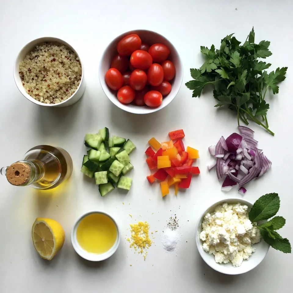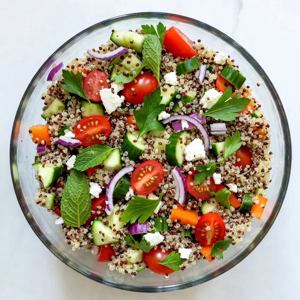 A refreshing salad made with quinoa, fresh vegetables, and herbs, dressed with a zesty lemon vinaigrette.