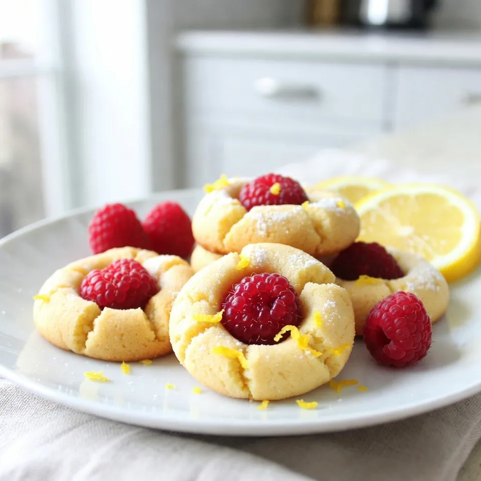 Arrange the cookies on a decorative plate and serve with a few whole raspberries and lemon slices for a vibrant touch.