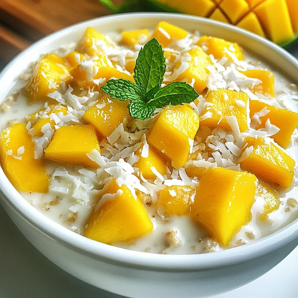 Serve your mango coconut oats in jars or bowls. Top with fresh mango pieces. Add a sprinkle of shredded coconut for crunch. Mint leaves add a nice touch. You could also add nuts or seeds for more texture. Enjoy your oats cold or warm them slightly if you prefer.