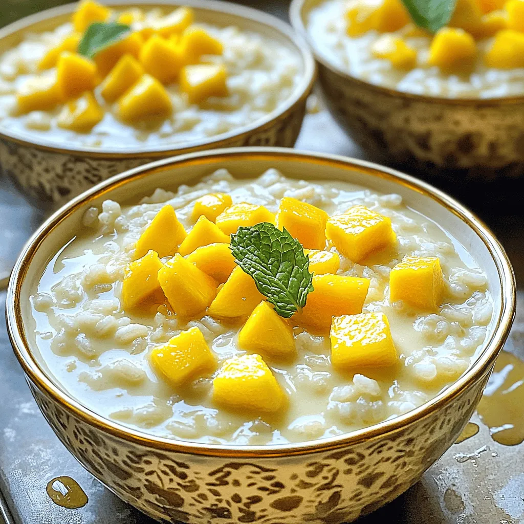 These ingredients work together to create a rich and delightful flavor. The Arborio rice gives it a nice creamy texture. The coconut milk adds a tropical twist that pairs perfectly with mango.
