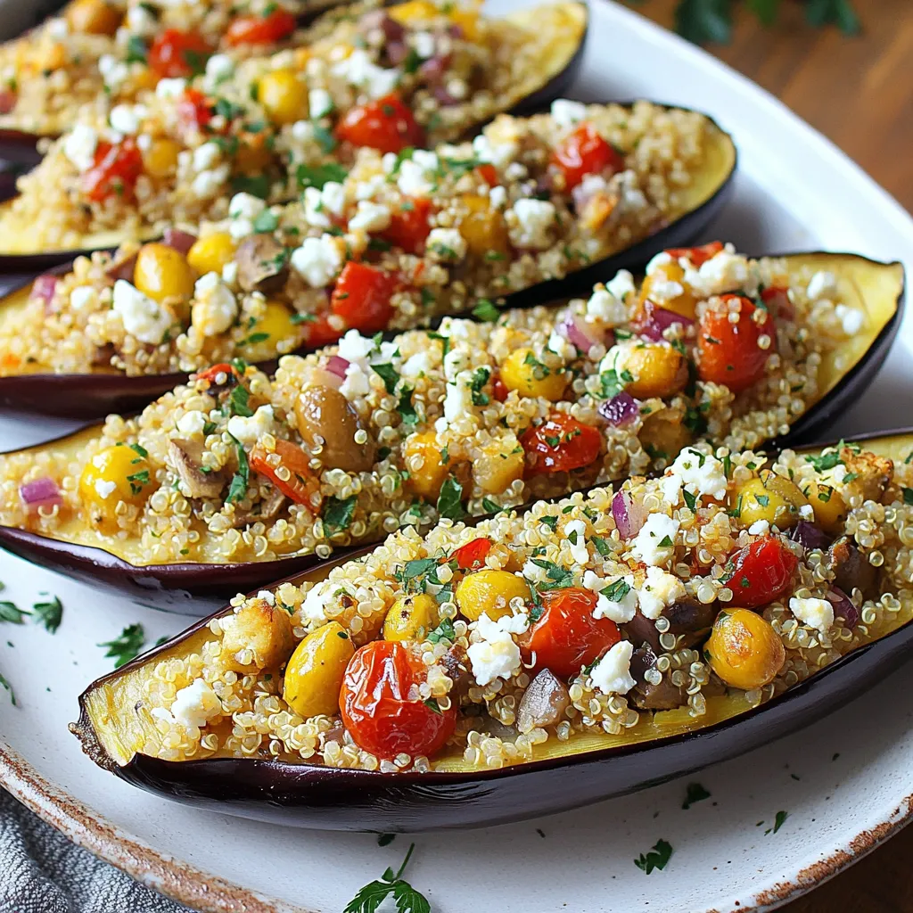 Delicious eggplants stuffed with a mixture of quinoa, vegetables, and feta cheese, baked to perfection.