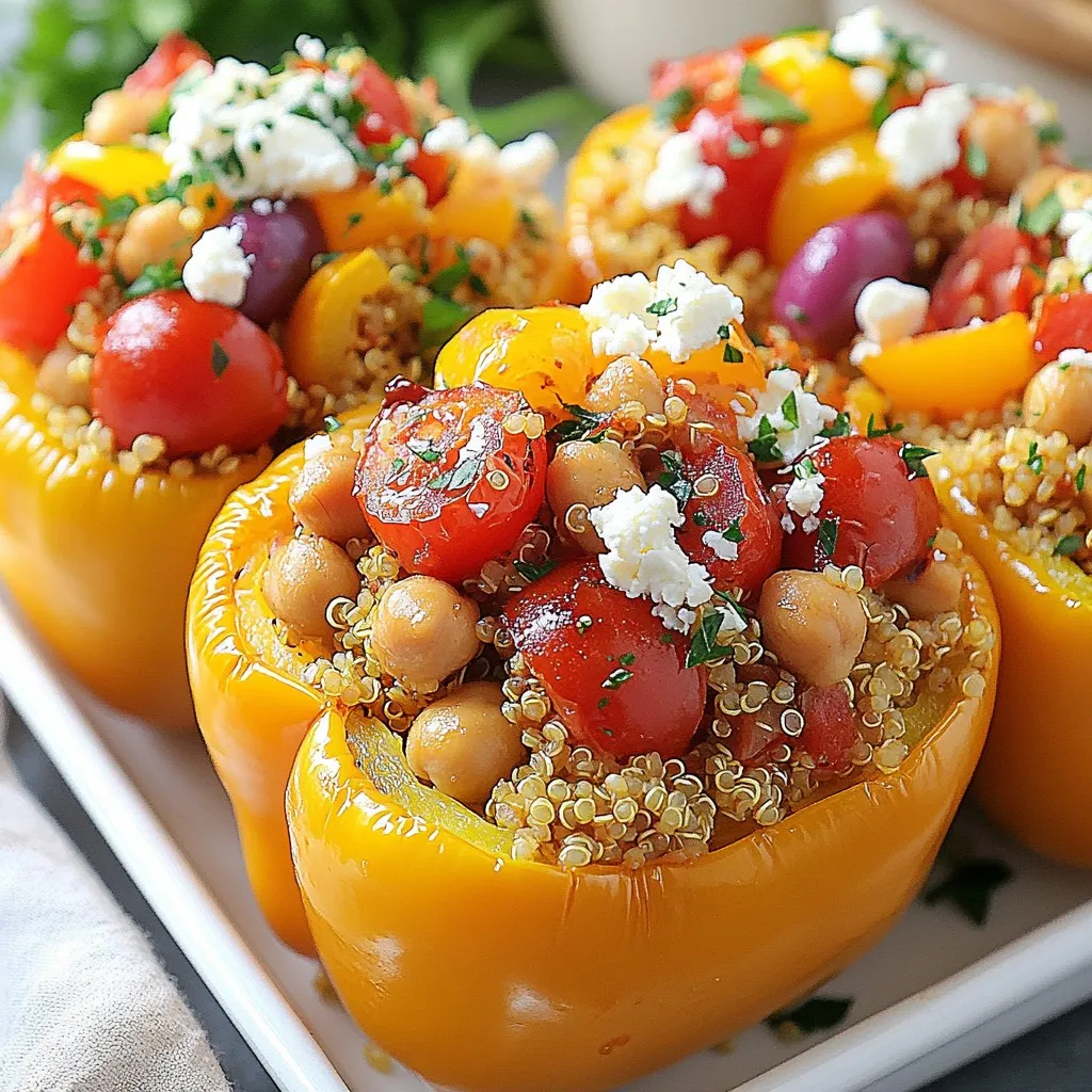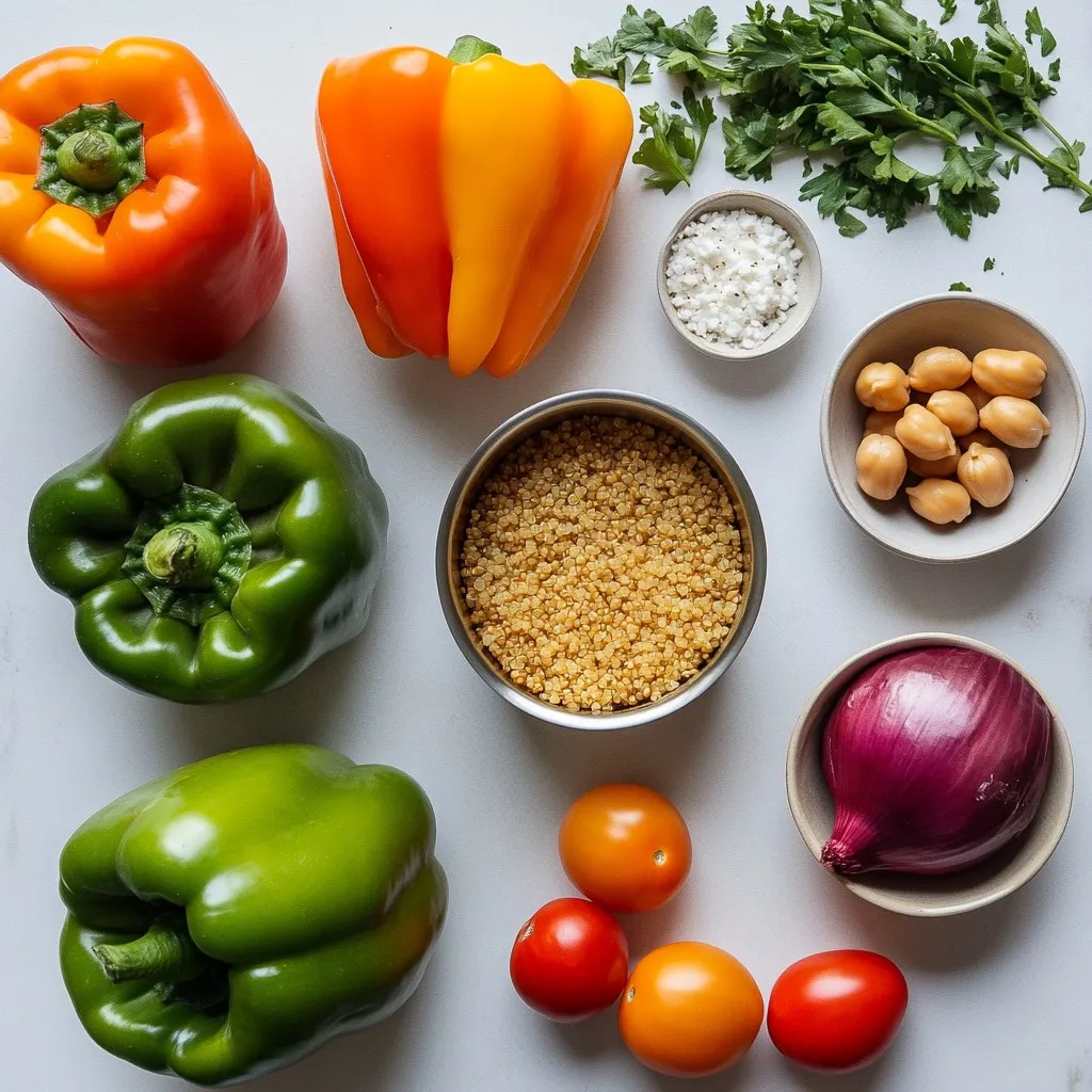 Delicious bell peppers filled with a savory mixture of quinoa, chickpeas, and feta cheese.