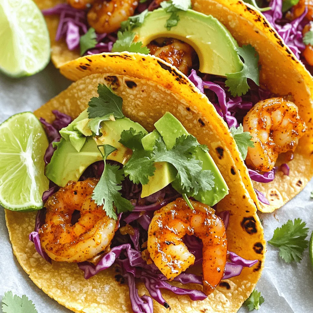 For these tasty tacos, you will need: - 1 lb large shrimp, peeled and deveined - 2 tablespoons olive oil - 4 cloves garlic, minced - 1 teaspoon chili powder - 1/2 teaspoon cayenne pepper (adjust for spice level) - Salt and pepper to taste - 1 teaspoon lime juice - 8 small corn tortillas - 1 cup shredded red cabbage - 1 avocado, sliced - Fresh cilantro, for garnish - Lime wedges, for serving These ingredients bring bold flavors. The shrimp is the star. The garlic adds depth, while the chili powder gives a kick. You can adjust the cayenne for your spice level. You can add these for a fun twist: - Sliced jalapeños for extra heat - Diced tomatoes for freshness - Crumbled feta for creaminess - Sour cream for a rich touch These toppings enhance the dish. Feel free to mix and match based on your taste. To make these tacos, gather: - A medium bowl for mixing - A large skillet for cooking shrimp - A spatula for flipping shrimp - A separate pan or grill for warming tortillas - A sharp knife for slicing toppings Using the right tools makes the process smooth. Each step will be easier with these handy items. To start, I recommend using large shrimp. They provide a nice bite. Rinse and dry the shrimp well. In a medium bowl, combine the shrimp with: - 2 tablespoons olive oil - 4 cloves garlic, minced - 1 teaspoon chili powder - 1/2 teaspoon cayenne pepper (adjust to your spice level) - Salt and pepper to taste - 1 teaspoon lime juice Toss everything together until the shrimp are well-coated. This mix gives the shrimp a bold flavor. Next, heat a large skillet over medium-high heat. Once the skillet is hot, add the shrimp in a single layer. Cook them for about 2 minutes until they turn pink and opaque. Then, flip the shrimp over and cook for another 1-2 minutes. They should be fully cooked and firm. Remove the skillet from heat. Perfectly cooked shrimp should be juicy and full of flavor. In another pan or on an open flame, warm the corn tortillas. Heat them for about 30-60 seconds on each side. You want them pliable and lightly charred. This makes the tortillas soft and adds a bit of smoky flavor. Now it's time to put everything together! On each warm tortilla, layer a handful of shredded red cabbage. This adds crunch and color. Next, place a generous amount of the cooked shrimp on top. Add avocado slices for creaminess. Finally, sprinkle fresh cilantro on each taco. This step brings brightness to the dish. Serve with lime wedges on the side. Squeeze some lime juice over the tacos for a zesty finish. Enjoy your bold flavor explosion! To make these tacos shine, you need a good mix of flavors. The garlic adds a nice kick. The chili powder gives warmth. The lime juice brightens up the dish. To balance it, taste as you go. If you find it too salty, add a bit more lime. Prefer it spicier? Just add more cayenne. Remember, cooking is all about finding what you love! When cooking shrimp, keep a close eye on them. They cook fast, usually in just a few minutes. Overcooking makes them tough. Cook until they turn pink and opaque. Always cook shrimp in a single layer. This ensures even cooking and nice browning. Use a non-stick skillet or add oil to prevent sticking. You can easily adjust the spice level. If you want more heat, add extra cayenne or chili powder. For a milder taco, reduce or skip the cayenne. You can also add toppings like sour cream or guacamole to cool it down. Experiment with fresh jalapeños for a fresh kick. Enjoy finding your perfect flavor! {{image_2}} If you want to switch things up, try different proteins. Chicken works great. Simply use the same spices. You can also use firm fish like tilapia or cod. Just make sure to cut it into small pieces. For a rich option, try beef or pork. Ground meat is quick to cook and adds a nice texture. Each protein will bring its own flavor to your tacos. For a meat-free version, consider using grilled veggies. Zucchini, bell peppers, and mushrooms taste amazing when grilled. You can also use black beans or chickpeas. They add protein and fiber. Toss them with the same chili and garlic flavors for a tasty bite. Another fun choice is roasted cauliflower. It adds a nice crunch and absorbs spices well. Toppings make tacos fun and unique. Try different salsas like mango or pineapple for sweetness. A classic tomato salsa is also a hit. For heat, use jalapeños or hot sauce. Fresh herbs like cilantro or parsley add brightness. Don’t forget about cheese! Crumbled feta or cotija are great options. Finally, squeeze fresh lime over your tacos for a zesty kick. To store leftover shrimp tacos, wrap each taco in plastic wrap. This keeps them fresh. Place them in an airtight container. Store the container in the fridge. Leftovers are best used within two days. Keep the shrimp and toppings separate if possible. This helps maintain the taco's crunch and flavor. To reheat your shrimp tacos, start by removing the toppings. This prevents sogginess. Heat a skillet over medium heat. Add the shrimp only until they are warm. This takes about 2-3 minutes. For the tortillas, warm them in the skillet for about 30 seconds on each side. This will bring back their softness. You can freeze the shrimp for later use. Place the cooked shrimp in a freezer bag. Remove as much air as possible before sealing. You can also freeze the tortillas separately. When ready to use, thaw shrimp overnight in the fridge. Reheat them as mentioned earlier. Enjoy your shrimp tacos again in no time! It takes about 20 minutes to make these tacos. You spend 10 minutes prepping and 10 minutes cooking. This quick time makes it easy to enjoy a tasty meal any day. Yes, you can use frozen shrimp. Just make sure to thaw them first. You can do this by placing them in cold water for about 15 minutes. This keeps the shrimp juicy and fresh. You can use flour tortillas if you prefer. Other good choices are lettuce wraps for a low-carb option. Just pick what you like best and enjoy! To adjust the spice, change the cayenne 