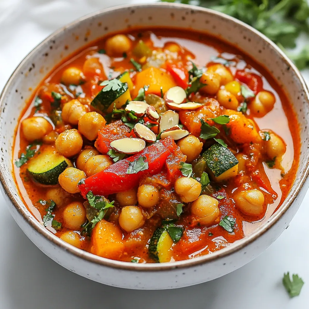 To boost the flavor of your Moroccan spiced chickpea tagine, use fresh herbs. Fresh cilantro or parsley adds a nice touch. You can also toast your almonds before adding them. This brings out their nutty taste. Another great idea is to add a squeeze of lemon juice before serving. This brightens the dish and adds freshness.