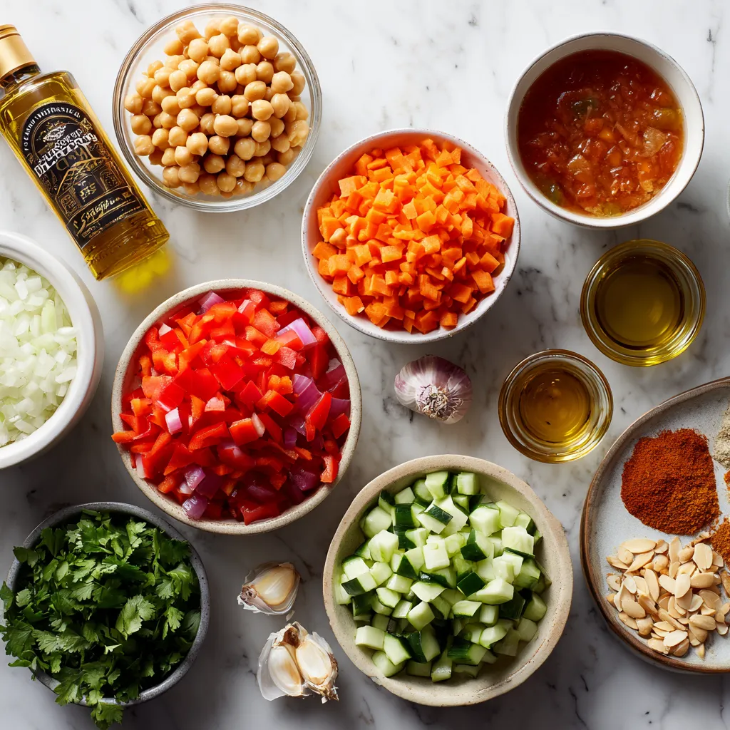 To make Moroccan Spiced Chickpea Tagine, start by gathering your ingredients. You will need canned chickpeas, onion, garlic, carrot, red bell pepper, zucchini, diced tomatoes, vegetable broth, olive oil, and spices.