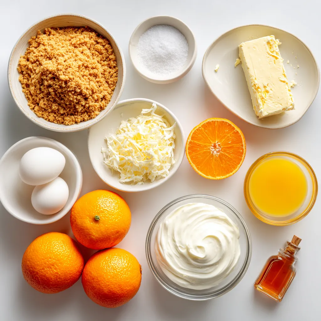 To start, gather all your ingredients. The graham cracker crumbs create a tasty crust. Use unsalted butter to bind it all together. Cream cheese brings a rich, creamy texture. Greek yogurt adds a light touch and tang. Granulated sugar sweetens the cheesecake just right. Eggs help it set. Vanilla extract adds warmth. Zest of oranges gives a fresh pop. Fresh orange juice brings bright flavor. Lastly, orange extract boosts the citrus taste. Don’t forget a pinch of salt to balance the sweetness.