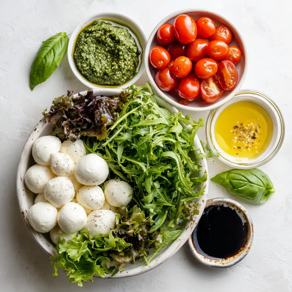 - 2 boneless, skinless chicken breasts - ½ cup basil pesto (store-bought or homemade) - 2 cups cherry tomatoes, halved - 1 cup fresh mozzarella balls (bocconcini) - 2 cups mixed greens (such as arugula and spinach) For this dish, I use fresh and bright ingredients. The chicken breasts are the star of the show, juicy and tender after grilling. I love using basil pesto for its rich flavor. Cherry tomatoes add a sweet burst, while fresh mozzarella brings a creamy touch. Mixed greens are essential for a crunchy base. - 1 tablespoon olive oil - Salt and pepper to taste - Fresh basil leaves for garnish - Balsamic glaze for drizzling (optional) I drizzle olive oil on the chicken to help it grill nicely. I season with salt and pepper to enhance the flavor. Fresh basil leaves make a lovely garnish. If you want extra flavor, balsamic glaze is a great choice! It adds sweetness and tang. {{ingredient_image_1}} First, preheat your grill or stovetop grill pan over medium-high heat. This step helps ensure even cooking. While the grill heats up, rub the chicken breasts with olive oil. This adds flavor and helps the spices stick. Next, season the chicken with salt and pepper on both sides. This simple seasoning will enhance the overall taste of the dish. Once your grill is ready, brush the chicken breasts generously with basil pesto on one side. Place the chicken pesto-side down on the grill. Grill the chicken for 6-7 minutes. Flip the chicken and brush the other side with more pesto. Grill for another 6-7 minutes. Your chicken is done when it reaches an internal temperature of 165°F (75°C). After grilling, let the chicken rest for 5 minutes before slicing it into strips. In a large bowl, combine the mixed greens, halved cherry tomatoes, and mozzarella balls. This mix adds color and freshness to your salad. Toss the salad gently with a drizzle of olive oil and season with salt and pepper to taste. Next, add the sliced chicken on top. Garnish with fresh basil leaves for added flavor. If you like, drizzle balsamic glaze over the salad for a touch of sweetness. Enjoy this fresh and flavorful dish! To make your chicken juicy, follow these steps: - Even Cooking: Start by preheating your grill. A hot grill cooks chicken evenly. - Use Oil and Seasoning: Rub the chicken with olive oil. This adds flavor and helps prevent sticking. - Check Doneness: Cook until the chicken reaches 165°F (75°C). Use a meat thermometer for best results. - Rest the Chicken: After grilling, let the chicken rest for five minutes. This keeps it juicy and flavorful. For the best salad, keep these tips in mind: - Washing Greens: Rinse your mixed greens under cold water. Use a salad spinner to dry them well. - Preparing Tomatoes and Mozzarella: Cut cherry tomatoes in half and ensure mozzarella balls are ready to go. - Drizzling Oil and Balsamic Glaze: When drizzling olive oil, do it slowly for even coverage. Apply balsamic glaze last for a beautiful finish. These tips will help you create a delicious and fresh Pesto Chicken Caprese Salad! Pro Tips Choose the Right Pesto: Using homemade basil pesto can elevate the flavor of your chicken. However, if you're pressed for time, a high-quality store-bought version will work just fine. Rest the Chicken: Allowing the grilled chicken to rest for 5 minutes before slicing helps retain its juices, ensuring each bite is tender and flavorful. Mix Greens Wisely: Combining a variety of greens like arugula and spinach not only adds texture but also a range of flavors, making the salad more interesting. Drizzle with Balsamic Glaze: A light drizzle of balsamic glaze adds a sweet and tangy finish to the salad, enhancing the overall flavor profile and presentation. {{image_2}} You can easily switch things up in your Pesto Chicken Caprese Salad. Instead of chicken, try grilled shrimp or tofu. Both options offer great protein and flavor. Shrimp cooks fast and adds a nice twist. Tofu is perfect for a lighter, vegetarian choice. You can also add more veggies to boost the salad. Crisp cucumbers bring a refreshing crunch. Bell peppers add sweetness and color. Feel free to mix and match your favorite veggies. This flexibility lets you create a unique dish each time. When it comes to pesto, you have choices! You can use store-bought pesto for quick prep or make your own for a fresh taste. Homemade pesto lets you control the flavor and ingredients. If you want something special, try flavor variations. Sun-dried tomato pesto gives a rich, tangy taste. Arugula pesto adds a peppery kick. Each type brings a new experience to your salad. Experiment with different pesto flavors to discover your favorite. To keep your Pesto Chicken Caprese Salad fresh, store the components separately. This way, the greens stay crisp, and the chicken remains juicy. Here’s how to do it: - Chicken: Place grilled chicken in an airtight container. It can last for up to 3 days in the fridge. - Salad: Store mixed greens, tomatoes, and mozzarella in another container. They will stay good for 2 days. - Pesto: If you have leftover pesto, keep it in a small jar with a thin layer of oil on top. It can last for about a week. Avoid mixing everything together until you’re ready to eat. This keeps the salad fresh and tasty. When reheating grilled chicken, you want it warm without drying it out. Here are some easy methods: - Microwave: Place chicken on a microwave-safe plate. Cover it with a damp paper towel. Heat in short bursts of 30 seconds until warm. - Stovetop: Heat a skillet on low. Add a splash of water. Place chicken in the skillet and cover. Cook for about 5 minutes or until heated through. - Oven: Preheat the oven to 350°F (175°C). Wrap chicken in foil and heat for 10-15 minutes. These methods keep the chicken moist and delicious, perfect for your salad! Yes, you can make this salad ahead. To keep it fresh, prep the ingredients separately. Store the mixed greens, cherry tomatoes, and mozzarella in airtight containers. Grill the chicken an