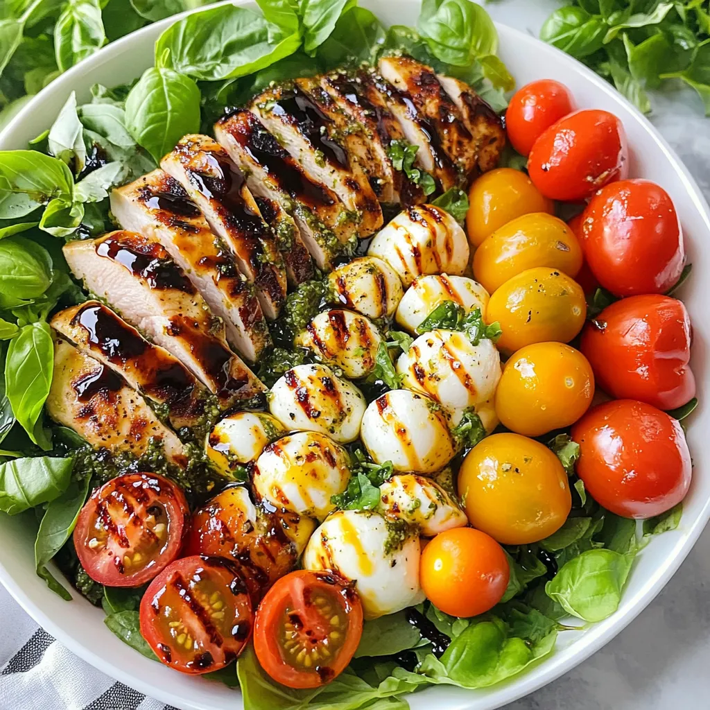 A fresh and vibrant salad featuring grilled pesto chicken, cherry tomatoes, mozzarella, and mixed greens.