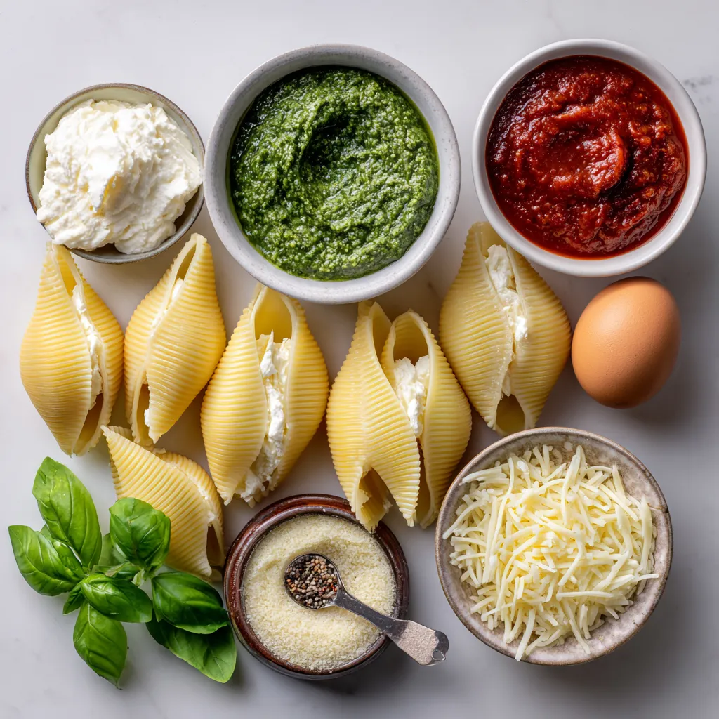 These ingredients work together to create a rich and tasty dish. Jumbo pasta shells are perfect for stuffing. Ricotta cheese gives a creamy texture. Pesto adds a fresh flavor that shines through. The blend of mozzarella and Parmesan provides a wonderful cheesy topping. The egg helps bind everything together. Garlic powder adds depth, while salt and pepper enhance the taste. Marinara sauce brings moisture and tang to the dish. Finally, fresh basil leaves make it look pretty and add aroma.
