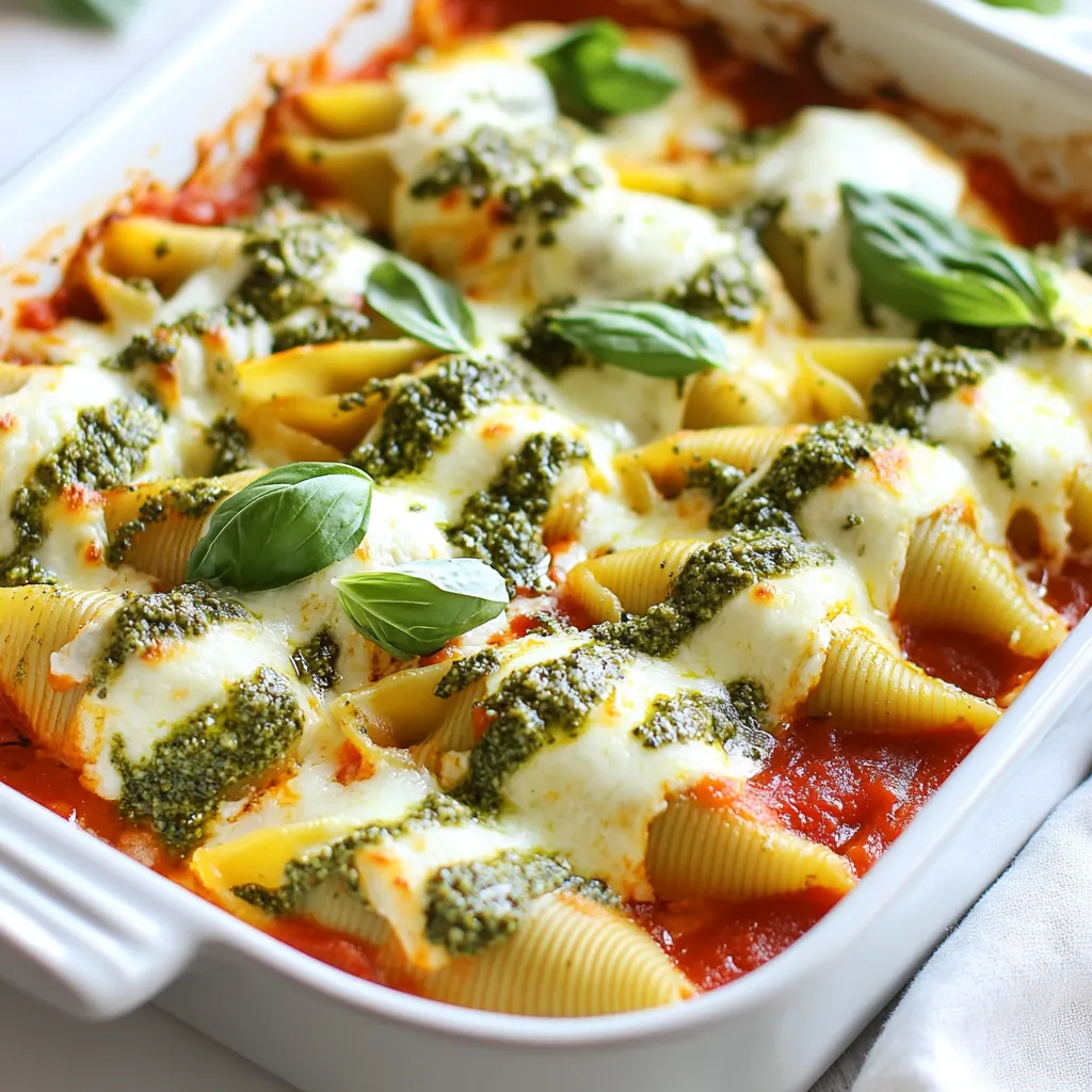 Delicious jumbo pasta shells filled with a creamy ricotta and pesto mixture, topped with marinara and mozzarella.