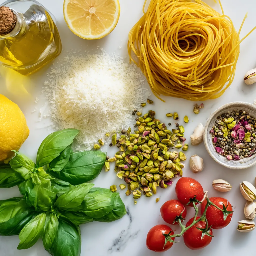 A delicious pasta dish featuring a creamy pistachio pesto made with fresh basil, garlic, and Parmesan cheese.