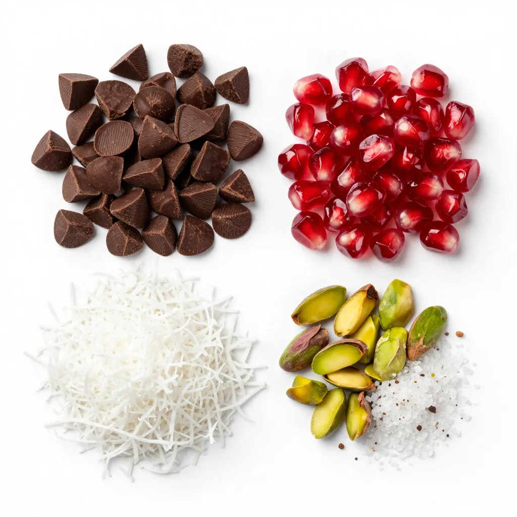 • While the chocolate is still melted, sprinkle the pomegranate seeds, shredded coconut, and chopped pistachios evenly over the surface. Lightly press them into the chocolate to ensure they stick.