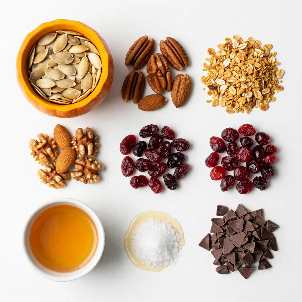 Start by taking a large mixing bowl. Add 1 cup of raw pumpkin seeds. Then, toss in 1 cup of mixed nuts. Use a mix of almonds, pecans, and walnuts. Next, add 1 cup of dried cranberries or raisins. Finally, stir in 1 cup of granola. I prefer granola with oats and honey for extra flavor.