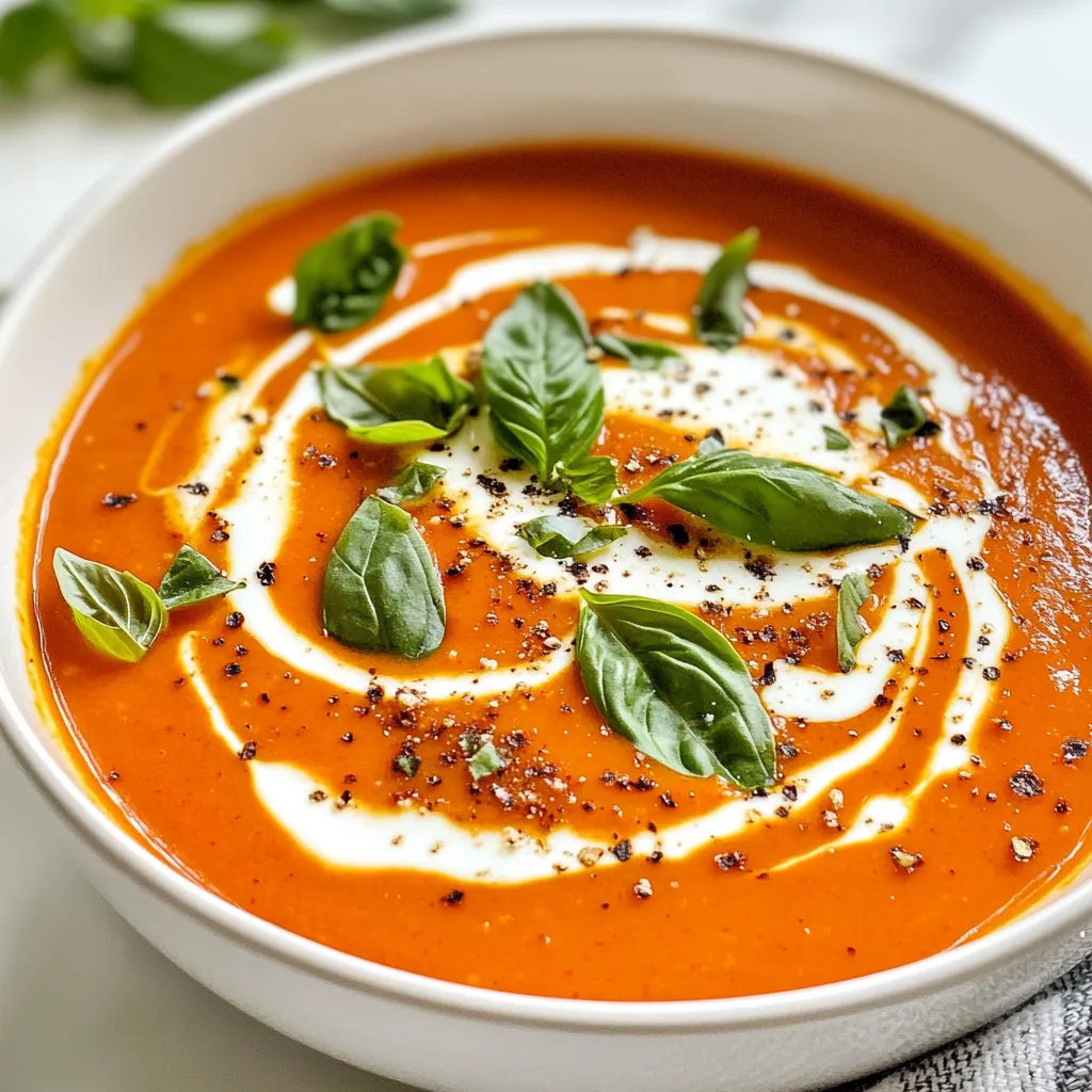 Return the blended soup to low heat. Stir in the heavy cream or coconut cream and adjust the seasoning if needed. Let the soup warm through before serving. Garnish with fresh basil leaves for a nice touch. Enjoy your delicious roasted red pepper tomato soup!