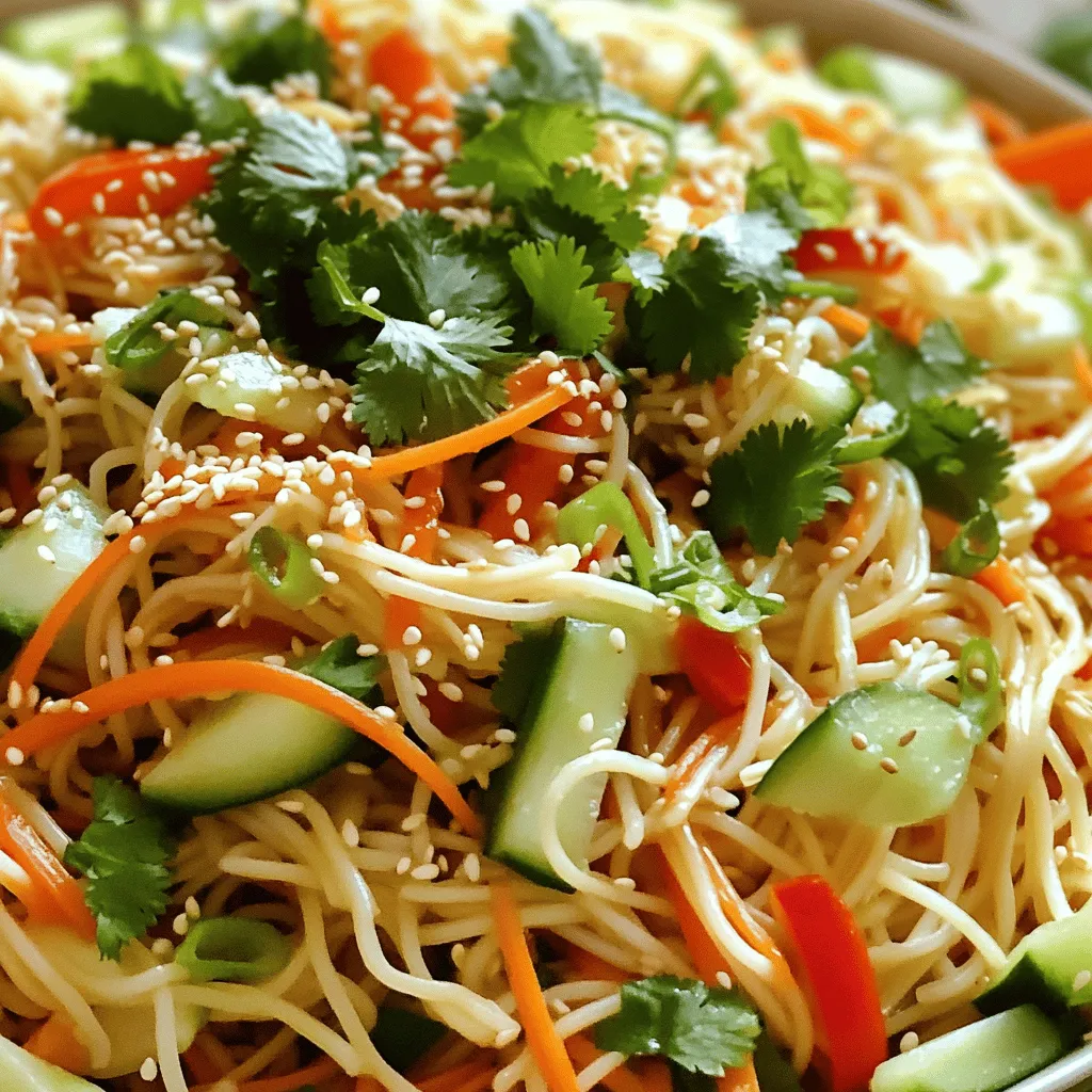 Combine Everything: In a large mixing bowl, add the cooked and cooled rice noodles, shredded carrots, bell pepper slices, cucumber, green onions, and chopped cilantro. Pour the dressing over the top.