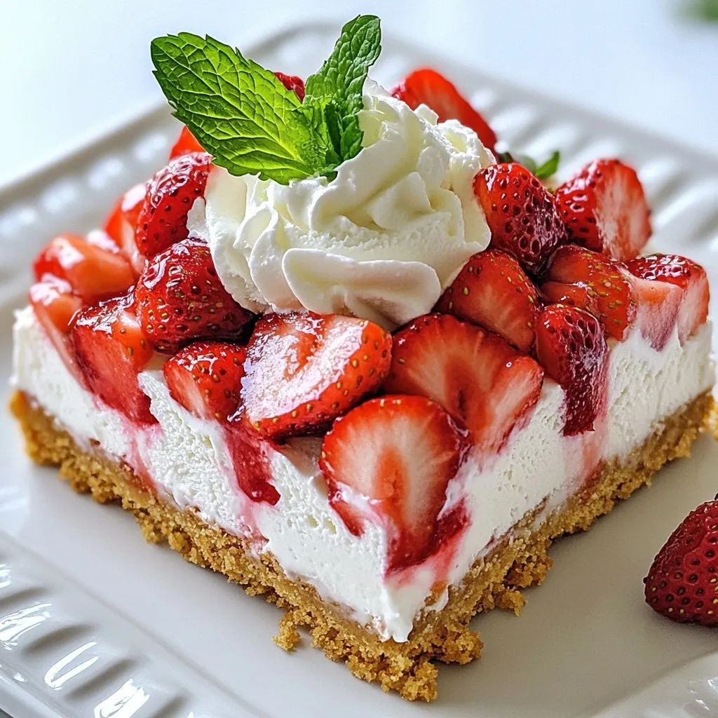 Now it’s time to assemble your bars. Spread one pint of slightly softened vanilla ice cream over the graham cracker crust. Use a spatula to smooth it out evenly. Next, spoon the macerated strawberries over the ice cream. Spread them out so every bite has strawberry goodness. Optionally, sprinkle some more graham cracker crumbs on top for added crunch. Cover the dish with plastic wrap and place it in the freezer. Let the bars freeze for at least four hours or until they are completely firm. Once frozen, lift the bars out using the parchment paper. Cut them into squares or rectangles. Serve with a dollop of whipped cream and a mint leaf on top for a lovely touch.