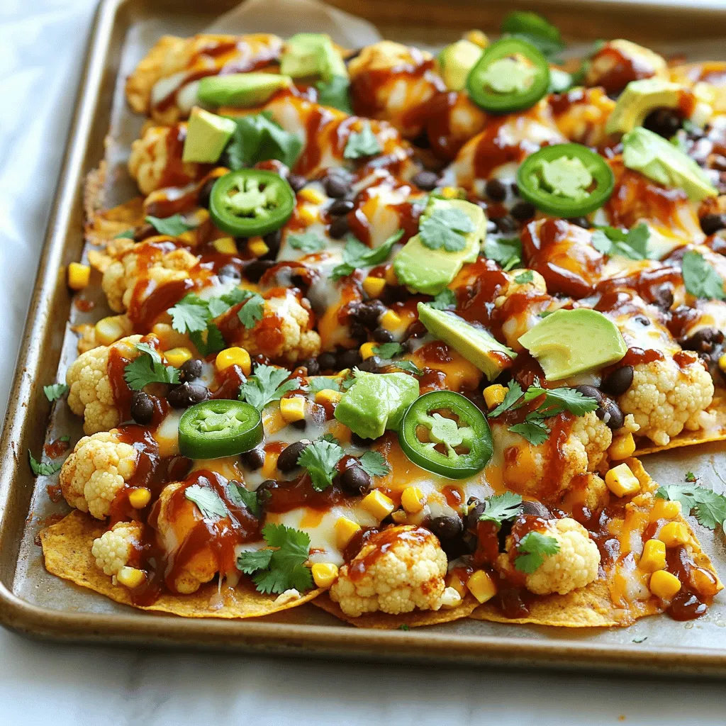 This mix of ingredients gives a fun twist to nachos. Cauliflower replaces chips, making them lighter. The spices add a warm flavor that sings with each bite. Black beans and corn bring texture and color. Cheese melts beautifully, while jalapeño adds heat. Fresh cilantro and avocado finish the dish, adding freshness. You can switch up the BBQ sauce to suit your taste. Use homemade for a personal touch. Enjoy this blend of flavors in every bite!