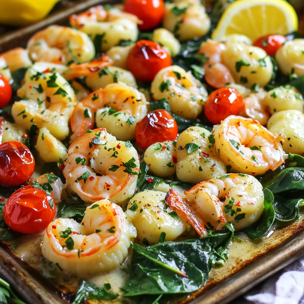 You can serve this dish straight from the sheet pan for a cozy vibe. If you want a fancier look, plate the shrimp and gnocchi individually. Make sure to include some spinach and tomatoes. A lemon wedge on the side adds a pop of color and flavor.
