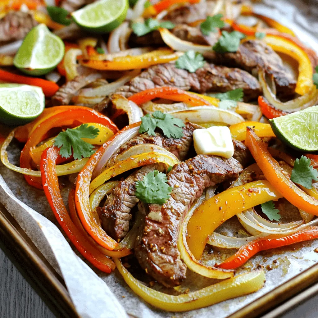 Once cooked, remove the sheet pan from the oven. Let it rest for a few minutes. This allows the juices to settle. Then, garnish the dish with chopped cilantro. Serve the fajitas with warm tortillas and lime wedges. The lime adds a fresh touch when drizzled over the top. Enjoy your delicious garlic butter steak fajitas family-style!