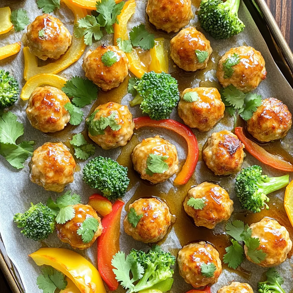 - 1 lb ground chicken - 1/4 cup breadcrumbs - 2 cloves garlic, minced - 1 teaspoon ginger, minced To make the meatballs, you start with ground chicken. This lean meat keeps the dish light. I add breadcrumbs to help bind the mixture. Garlic and ginger bring in great flavor. Their aroma fills your kitchen as they cook, making the meal even better. - 1/4 cup honey - 1/4 cup soy sauce (low sodium preferred) - 2 tablespoons rice vinegar The sauce is the star of this dish. Honey adds sweetness and helps caramelize the meatballs. Soy sauce gives a savory touch, while rice vinegar adds a bit of tang. Together, they create a balanced flavor that complements the chicken. - 2 cups mixed bell peppers, sliced - 1 cup broccoli florets - Fresh cilantro, for garnish For veggies, I use colorful bell peppers and broccoli. They add crunch and nutrition. Plus, they soak up the sauce while cooking. Fresh cilantro makes a great garnish. It adds a burst of freshness and color right before serving. Set your oven to 400°F (200°C). This high heat helps the meatballs brown nicely. Line a large baking sheet with parchment paper. This makes cleanup a breeze. In a large bowl, combine the following: - 1 lb ground chicken - 1/4 cup breadcrumbs - 1/4 cup finely chopped green onions - 1 egg, lightly beaten - 2 cloves garlic, minced - 1 teaspoon ginger, minced - 1 teaspoon salt - 1/2 teaspoon pepper - 1/4 teaspoon red pepper flakes (optional) Mix everything well. Make sure the ingredients blend together. This step is key to juicy meatballs. Shape the mixture into small meatballs. Each should be about 1 inch wide. Place them on one side of the prepared baking sheet. Keep some space between them for even cooking. In a small bowl, whisk together: - 1/4 cup honey - 1/4 cup soy sauce - 2 tablespoons rice vinegar - 1 tablespoon sesame oil Whisk until it’s fully mixed. This sauce adds a sweet and savory touch. On the other side of the baking sheet, spread out: - 2 cups sliced bell peppers - 1 cup broccoli florets Drizzle with a little olive oil, salt, and pepper. Toss the veggies to coat them evenly. They will cook and soak up the flavors. Place the sheet pan in the oven. Bake for about 20-25 minutes. Check that the internal temperature of the meatballs reaches 165°F. When they are done, the veggies should be tender. For an extra glaze, brush the meatballs with more sauce in the last 5 minutes. Enjoy the aroma filling your kitchen! To make great meatballs, start with the right blend. Ground chicken needs binding. I use breadcrumbs and an egg to help hold them together. Mix everything well. This keeps the meatballs from falling apart. Shape them into small balls, about one inch wide. This size cooks evenly. Want more taste? You can add herbs and spices. Fresh herbs like parsley or basil brighten the dish. Dried spices like cumin or paprika add depth. If you enjoy heat, try adding more red pepper flakes. Just a pinch can change the flavor! Using parchment paper is key. It prevents sticking and makes cleanup easy. Place your meatballs and veggies with space in between. This lets the heat flow and helps everything cook evenly. Avoid crowding the pan. Give each meatball room to shine! {{image_2}} If you want to switch things up, try using turkey or beef. Both options work well in this recipe. Turkey gives you a leaner meatball, while beef offers a richer flavor. When using turkey, keep the seasoning similar to maintain that sweet and savory taste. For beef, you might want to add a bit more seasoning to balance the flavors. Just remember, cook time may vary slightly based on the meat used. You can also play with different sauces. Teriyaki sauce adds a sweet and salty taste that pairs nicely with the meatballs. Sweet chili sauce gives a spicy kick, perfect for those who like a bit of heat. Whichever sauce you choose, just mix it well and pour it over the meatballs and veggies, just like in the original recipe. Experimenting with these sauces can lead to new favorites! Don’t limit yourself to just bell peppers and broccoli. You can use any veggies you love. Carrots, snap peas, or zucchini can add great color and texture. Just chop them into similar sizes so they cook evenly. You can even mix in some onions for added flavor. The versatility of vegetables lets you customize this dish to fit your taste and what you have on hand. To keep your leftovers fresh, use airtight containers. Glass or plastic containers work well. Allow the meatballs to cool before sealing. Store them in the fridge for up to four days. If you have leftover veggies, store them separately to keep them crisp. To reheat meatballs, use the oven for the best results. Preheat your oven to 350°F. Place the meatballs on a baking sheet. Add a splash of water to keep them moist. Heat for about 10-15 minutes until they are warm and tender. You can also use the microwave if you're in a hurry. Heat in 30-second intervals, checking often. To freeze meatballs, let them cool completely. Arrange them in a single layer on a baking sheet. Freeze them for about an hour. Once frozen, place them in a freezer-safe bag. They can last up to three months in the freezer. To defrost, move them to the fridge overnight before reheating. This method keeps them juicy and flavorful. Yes, you can make these meatballs ahead of time. Prepare the meatball mixture and shape them. Place the uncooked meatballs on a baking sheet. Cover them with plastic wrap and store in the fridge for up to a day. You can also freeze them for longer storage. Just freeze them on the sheet first, then transfer to a bag. When ready to cook, bake them from frozen, adding a few extra minutes to the cooking time. These meatballs pair well with many sides. Consider serving them with: - Steamed rice - Quinoa or couscous - A fresh green salad - Roasted vegetables - Noodles tossed in sesame oil These sides balance the sweet and savory flavors of the meatballs and make a complete meal. To ensure your meatballs are fully cooke