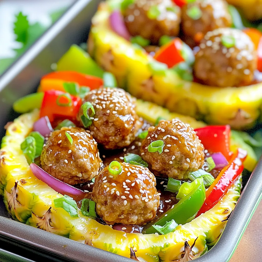 Serving these bowls is fun! Scoop the meatballs and veggies into the hollowed-out pineapples. Garnish with chopped green onions and sesame seeds. You can also add some lime wedges for a zesty kick. This makes the dish look bright and fresh, perfect for sharing!