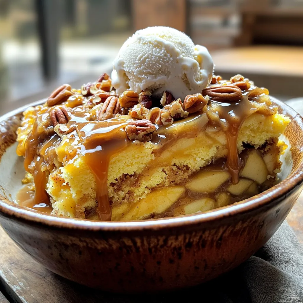- 2 cans (21 oz each) apple pie filling - 1 teaspoon cinnamon - 1 box (15.25 oz) yellow cake mix - 1 cup unsalted butter, melted - 1 cup caramel sauce - 1 cup chopped pecans (optional) - Vanilla ice cream, for serving To make this slow cooker caramel apple dump cake, gather your ingredients first. You need two cans of apple pie filling. This gives a sweet and fruity base. Next, grab one teaspoon of cinnamon. It adds warmth and spice to the cake. You will also need one box of yellow cake mix. This makes up the cake layer. For richness, use one cup of melted unsalted butter. It helps to create a moist texture. A cup of caramel sauce is a must for that gooey delight. If you like crunch, consider adding one cup of chopped pecans. They are optional but very tasty. Lastly, have some vanilla ice cream ready for serving. It pairs perfectly with the warm cake. This simple list of ingredients makes it easy to whip up a delicious dessert. Keep these in mind as you prepare to create this delightful treat! - First, combine the apple pie filling and cinnamon in a mixing bowl. Stir this well to spread the cinnamon evenly through the filling. The warm smell of cinnamon will fill your kitchen. It sets the stage for a cozy dessert. - Next, prepare your slow cooker. Spray the inside with non-stick cooking spray. This step helps the cake slide out easily once it’s done. - Now, layer the ingredients. Pour the apple filling mixture into the bottom of the slow cooker. Spread it out evenly. Then, sprinkle the dry yellow cake mix over the top of the apple filling. Do not mix; just let it rest there. - Set the cooking time and temperature next. Cover your slow cooker and cook on low for 3 to 4 hours. You want the top to be golden brown, and the edges should bubble gently. - Checking for doneness is key. After about 3 hours, peek under the lid. If the top looks golden, it’s ready. If not, let it cook a bit longer. - Allow the cake to cool for about 10 to 15 minutes before serving. This helps the flavors settle and makes serving easier. - For ideal serving suggestions, dish it out warm in bowls. Top each serving with a scoop of vanilla ice cream. Drizzle more caramel sauce on top for extra sweetness. This brings your dessert to a whole new level. Enjoy! - Ensuring even cooking: To cook your cake evenly, layer the apple filling on the bottom first. Spread it out well. Sprinkle the dry cake mix on top without stirring. This helps avoid raw spots. - Avoiding soggy cake layers: Drizzle melted butter carefully over the cake mix. This keeps the top from getting too wet. If you add pecans, place them on top of the butter layer. They add a nice crunch. - Adding spices or extracts: Feel free to spice things up! Try adding a pinch of nutmeg or a splash of vanilla extract. This can boost the flavor of your apple pie filling. - Creative topping ideas: When serving, think beyond just ice cream. Add whipped cream, or sprinkle chopped nuts on top. A drizzle of caramel sauce makes it even better. You can also use chocolate sauce for a twist! {{image_2}} You can switch the apple pie filling for other flavors. Cherry and blueberry pie fillings work great. They add a fun twist. Each fruit brings a unique taste that is sure to please everyone. Try mixing different fillings for a layered effect. This gives you a new dessert each time. If you need gluten-free options, use a gluten-free cake mix. Many brands make tasty alternatives. For vegan choices, replace the butter with coconut oil. You can also swap the caramel sauce for a vegan version. These small changes keep the dessert just as delicious while meeting your needs. You can change up the toppings for more variety. Instead of pecans, try walnuts or almonds. Each nut adds a different crunch and flavor. For a fun twist, swap the caramel sauce with chocolate sauce. This creates a rich and sweet dessert that chocolate lovers will adore. Play around with toppings for your perfect blend! After you finish your Slow Cooker Caramel Apple Dump Cake, let it cool. Cooling helps prevent sogginess. Once it cools, wrap the cake in plastic wrap or foil. This keeps it fresh. For best results, store it in an airtight container. This helps it stay moist and tasty. If you don’t have one, you can leave it uncovered. Just remember, uncovered storage may dry it out faster. When you're ready to enjoy leftovers, you can reheat your cake. Use a microwave for quick warming. Place a piece on a plate and heat for about 30 seconds. If you prefer oven reheating, set it to 350°F. Place the cake in a baking dish, cover it with foil, and heat for 10-15 minutes. This keeps the texture nice. As you reheat, check it often. You want it warm but not too hot. Enjoy your cake just like the first time! Can I make this recipe in advance? Yes, you can prepare the layers in advance. Mix the apple pie filling and cinnamon. Layer the filling and cake mix in the slow cooker. Cover it and store it in the fridge. When you're ready, just drizzle the butter and caramel sauce before cooking. How do I know when it's done cooking? Check the top of the cake. It should be golden brown. The edges should bubble a bit. You can also insert a toothpick into the center. If it comes out clean, it’s done. Can I use a different type of cake mix? Absolutely! You can use chocolate, spice, or even white cake mix. Each will give a unique twist. Just remember to adjust any spices based on your choice for the best flavor. What can I serve with Slow Cooker Caramel Apple Dump Cake? I love serving it warm with a scoop of vanilla ice cream. You can also drizzle more caramel sauce on top. Whipped cream or nuts can add a nice touch too! How long does leftovers last? Leftovers can last about 3-4 days in the fridge. Store them in an airtight container. Just reheat a portion in the microwave when you're ready to enjoy it again. This article covered how to make a Slow Cooker Caramel Apple Dump Cake. You learned about the key ingredients, easy preparatio