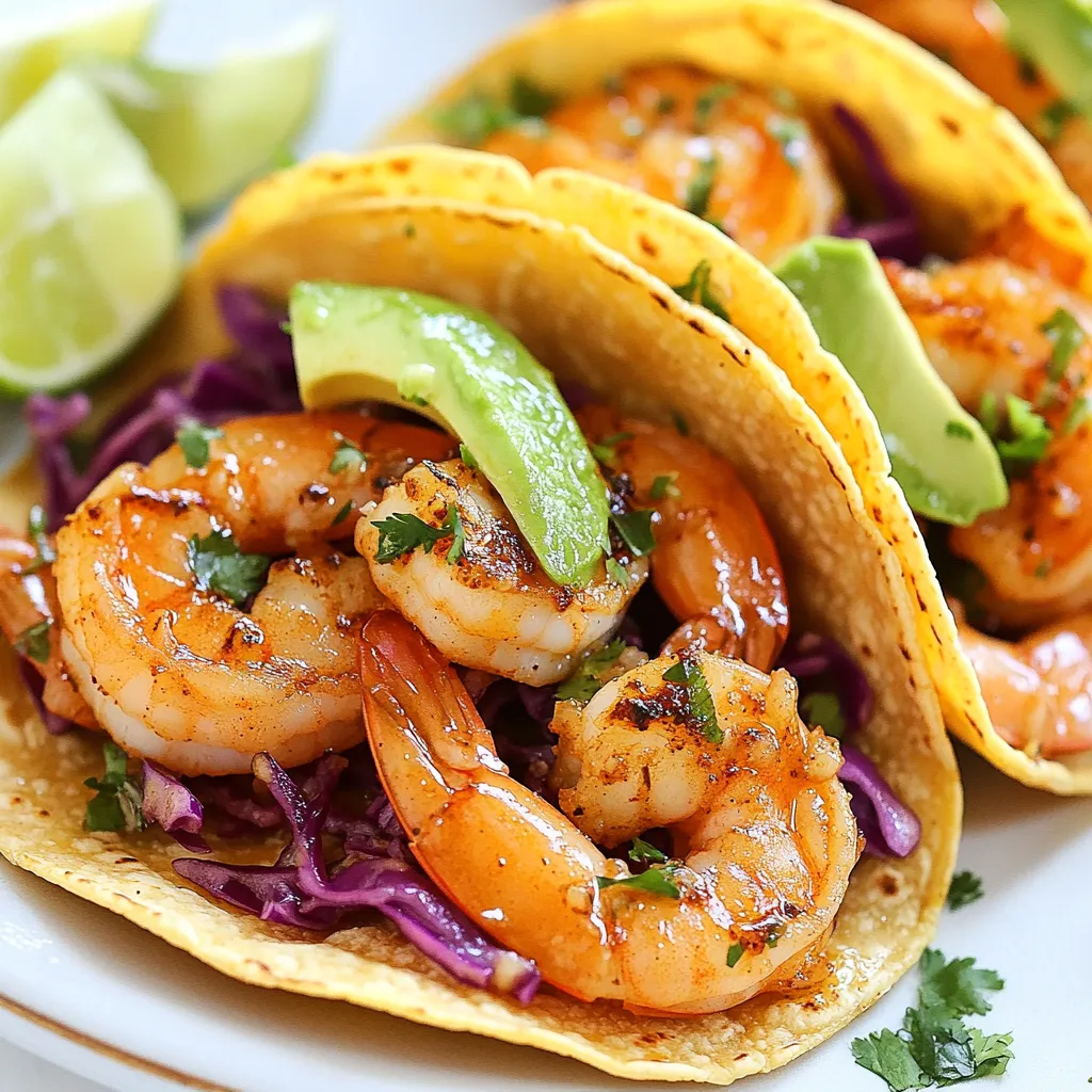 Delicious tacos filled with spicy garlic shrimp, topped with fresh avocado and cabbage.