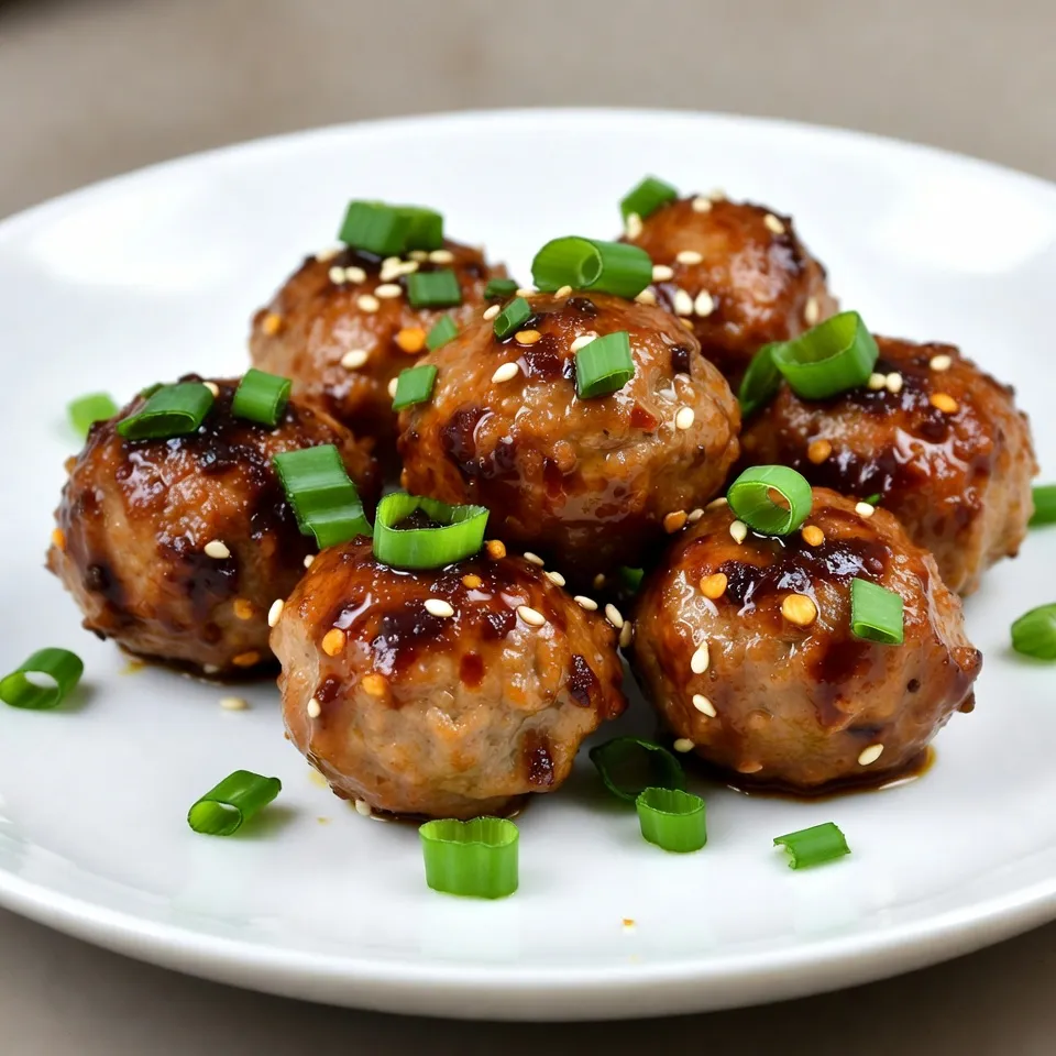 Place the glazed meatballs on a serving platter and garnish with sliced green onions and a sprinkle of sesame seeds.