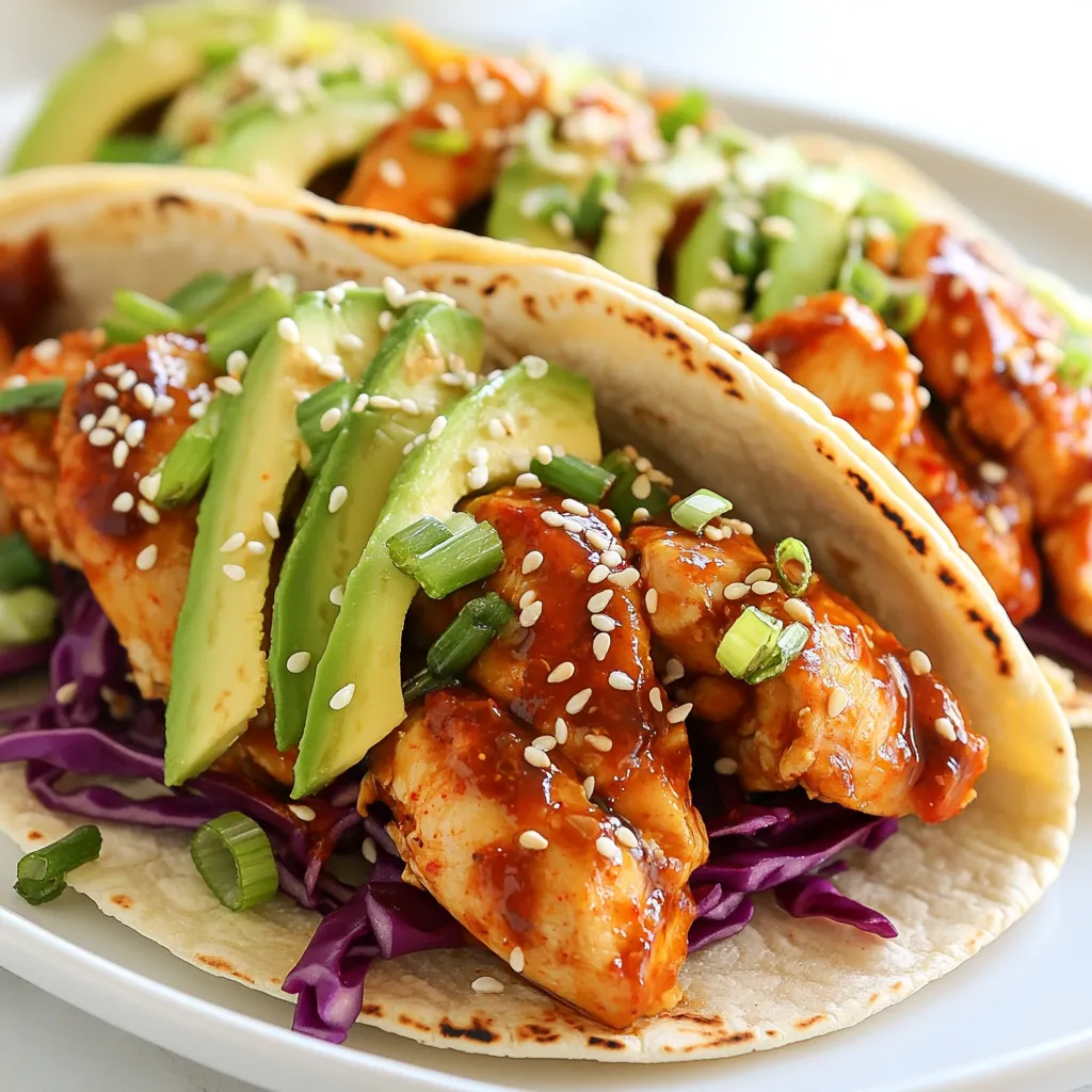 – Layering Ingredients: On each tortilla, place a good scoop of the spicy chicken. Add a handful of shredded cabbage, a few slices of avocado, and sprinkle with sesame seeds. Top with chopped green onions for extra flavor. Enjoy your delicious tacos!