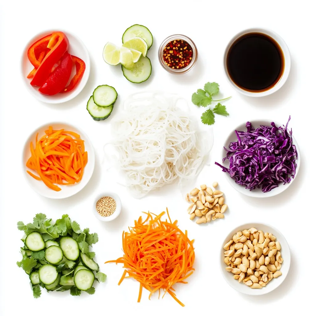 Gather these ingredients before you start. Fresh veggies add crunch and color. Peanut butter and other dressing ingredients bring rich flavors and creaminess. You can adjust the chili paste to fit your spice level. This mix of flavors and textures makes for a fun dish. Enjoy making it!