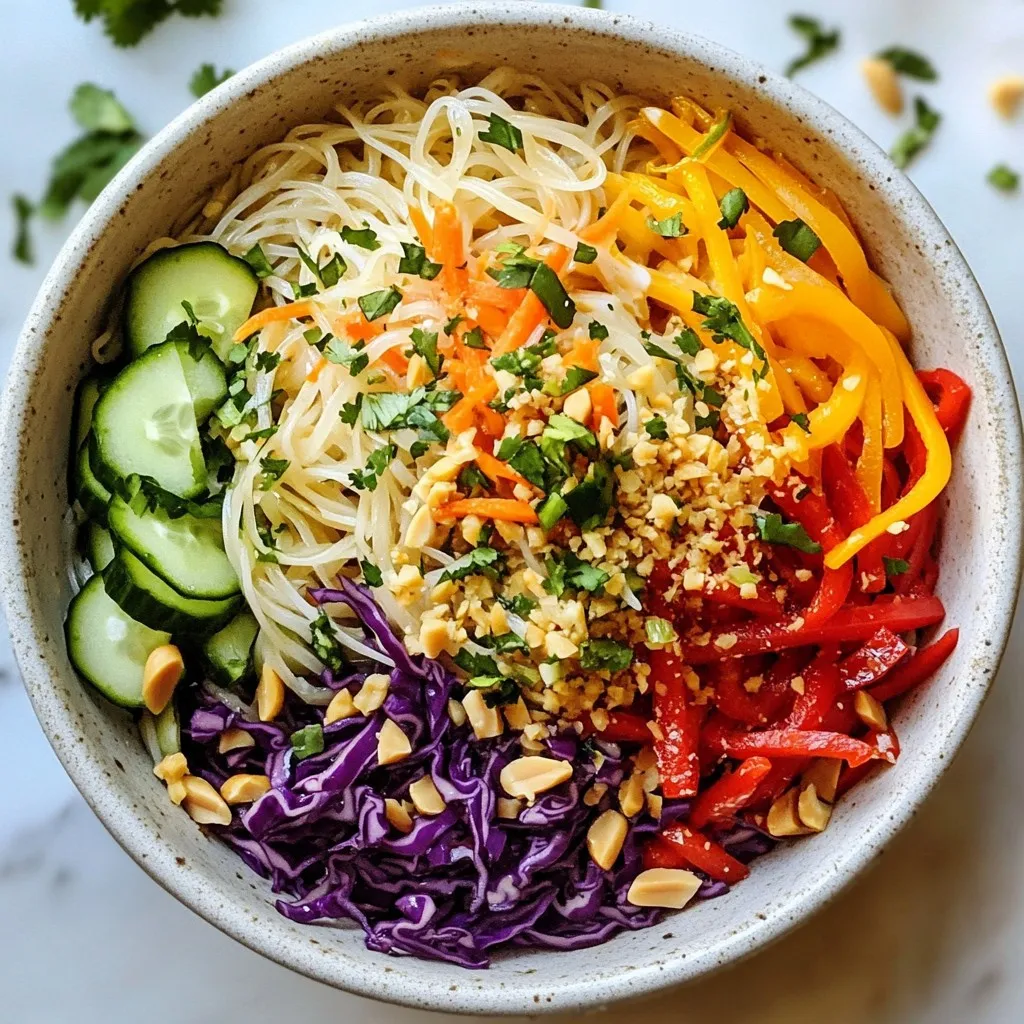 A refreshing and spicy salad featuring rice noodles, fresh vegetables, and a creamy peanut dressing.