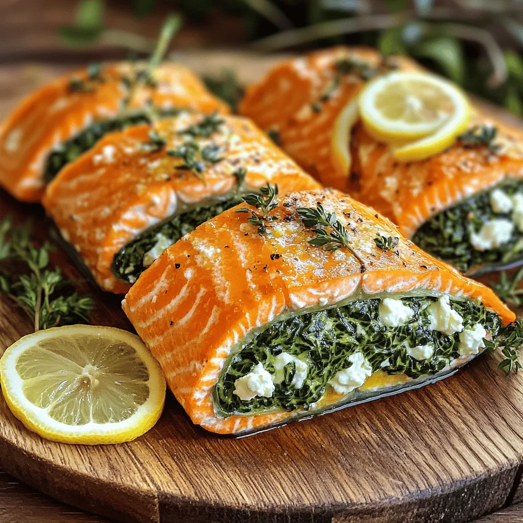 - 4 salmon fillets (6 oz each) - 2 cups fresh spinach, chopped - 1 cup feta cheese, crumbled - 2 cloves garlic, minced - 1 tablespoon olive oil - 1 tablespoon lemon juice - 1 teaspoon dried oregano - Salt and pepper to taste - Lemon slices for garnish - Fresh herbs for presentation For this dish, I love using fresh ingredients. The salmon brings a rich flavor. The spinach adds color and nutrition. Feta cheese gives a creamy and tangy taste. Garlic brings out the best in all these flavors. The olive oil keeps everything moist and tasty. Lemon juice brightens the dish and adds a fresh zing. Dried oregano gives a nice, earthy aroma. Always use salt and pepper to bring all the flavors together. When I prepare this dish, I like to think about the presentation too. Adding lemon slices on the plate makes it look fresh and inviting. A sprinkle of fresh herbs adds a touch of elegance. This not only enhances taste but also makes the meal feel special. Feel free to mix in your favorite herbs or spices. This dish is easy to customize, so let your creativity shine! - Step 1: Preheat the oven and prepare the baking sheet First, set your oven to 375°F (190°C). While it heats, line a baking sheet with parchment paper. This helps the salmon not stick and makes cleanup easy. - Step 2: Sauté garlic and spinach In a medium skillet, add one tablespoon of olive oil. Heat it over medium heat. Once hot, add two minced cloves of garlic. Sauté for 1-2 minutes until you smell the garlic. Then, add 2 cups of chopped spinach. Cook this for about 3-4 minutes until the spinach wilts. Remove the skillet from the heat. - Step 3: Combine spinach with feta and seasonings Take your cooked spinach and garlic mixture and place it in a mixing bowl. Add one cup of crumbled feta cheese, one tablespoon of lemon juice, and one teaspoon of dried oregano. Season with salt and pepper to taste. Mix everything well until combined. - Step 4: Prepare salmon fillets for stuffing Take 4 salmon fillets and place them skin-side down on the prepared baking sheet. Using a sharp knife, carefully cut a pocket along the side of each fillet. Be gentle to avoid cutting all the way through. - Step 5: Stuff the salmon and bake Take your spinach-feta mixture and stuff it into the pockets of the salmon fillets. Press it down gently so it stays inside. Once done, place the baking sheet in the oven. Bake for about 15-20 minutes, or until the salmon is cooked through and flakes easily with a fork. - Step 6: Resting and serving the salmon After baking, remove the salmon from the oven. Let it rest for 5 minutes. This helps the flavors settle. You can serve the stuffed salmon on a plate with lemon slices for garnish. Enjoy it with roasted vegetables or a light salad. - To keep your salmon moist, don’t overcook it. Bake for just 15-20 minutes. - Use a sharp knife to cut a pocket in each fillet. This makes stuffing easy. - Stuff the salmon pockets firmly, but don’t overstuff. You want it to stay intact. - Add fresh dill or parsley for extra flavor. These herbs pair well with salmon. - Serve with a lemon butter sauce or a yogurt dill sauce for a creamy touch. - Roasted veggies or a simple salad go great on the side. They add color and crunch. - Use a sturdy baking sheet lined with parchment paper. This makes cleanup simple. - A small spoon or spatula works well for stuffing the fillets. - Keep a sharp knife handy for cutting the pockets in the salmon. This keeps the fillets neat. {{image_2}} You can make this dish your own by swapping out some ingredients. If you want to replace feta cheese, try goat cheese or ricotta. Both will add a creamy texture and unique taste to your salmon. For greens, while spinach is great, you can also use kale or Swiss chard. These options will give a different flavor and color to your filling. They are also packed with nutrients. When it comes to cooking methods, you have options. Grilling salmon adds a nice smoky flavor. Just be careful not to overcook it. Baking is simple and keeps the salmon moist. You can bake it exactly as the recipe states. Air frying is another fun method. It cooks the salmon quickly and gives it a crispy outer layer. Just set your air fryer to 400°F and cook for about 10-15 minutes. You can easily adapt this dish for different diets. To make it gluten-free, check your feta label. Most brands are safe, but it's always good to read. For low-carb diets like keto, skip the bread crumbs if you use any. Focus on the salmon and spinach filling. You can add more cheese for flavor and richness. This keeps it delicious and fitting for keto plans. To store leftover spinach feta stuffed salmon, first let it cool. Place it in the fridge after it reaches room temperature. Use an airtight container to keep it fresh. This method helps prevent the salmon from drying out. When reheating, avoid drying out the salmon. The best method is to use the oven. Preheat your oven to 350°F (175°C). Place the salmon in a baking dish, cover with foil, and heat for 10-15 minutes. This keeps the fish moist and flavorful. You can also use a microwave. Heat for 1-2 minutes, but check often to avoid overcooking. To freeze stuffed salmon, wrap each piece tightly in plastic wrap. Then place them in a freezer-safe bag. This prevents freezer burn and keeps the taste intact. When you want to eat it, move the salmon to the fridge for 24 hours to defrost. For quicker thawing, submerge it in cold water for about an hour. Can I use frozen salmon fillets for this recipe? Yes, you can use frozen salmon. Just make sure to thaw them completely first. This helps the salmon cook evenly. To thaw, place the fillets in the fridge overnight or run them under cold water for faster results. How do I know when salmon is fully cooked? The salmon is done when it flakes easily with a fork. You can also check the internal temperature. It should be at least 145°F (63°C). This ensures it is safe to eat and still juicy. Can I prepare the spinach-feta mixture