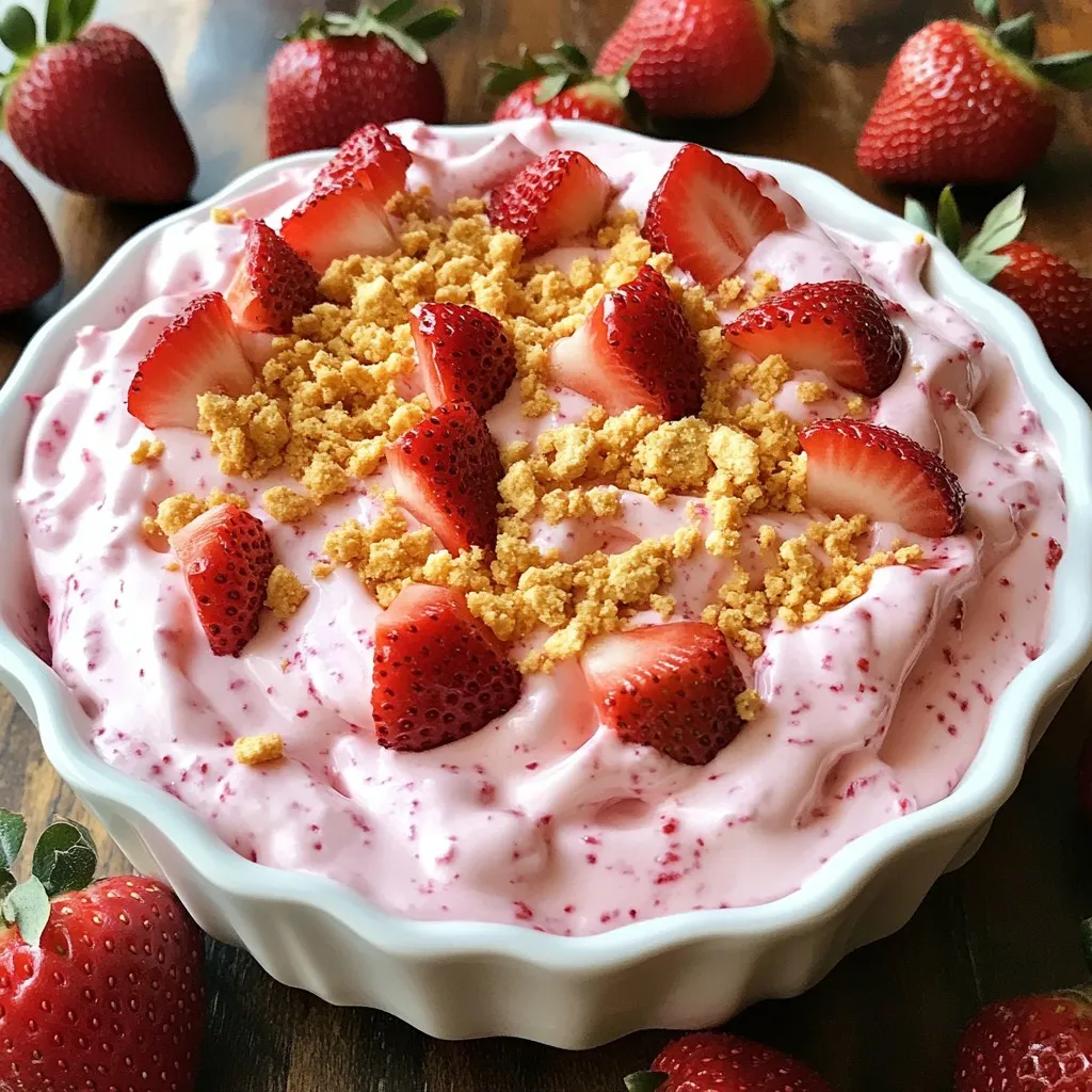 Serve the dip in a decorative bowl with extra strawberries arranged around the edge. Provide graham crackers or sliced fruits such as apples and bananas for dipping.