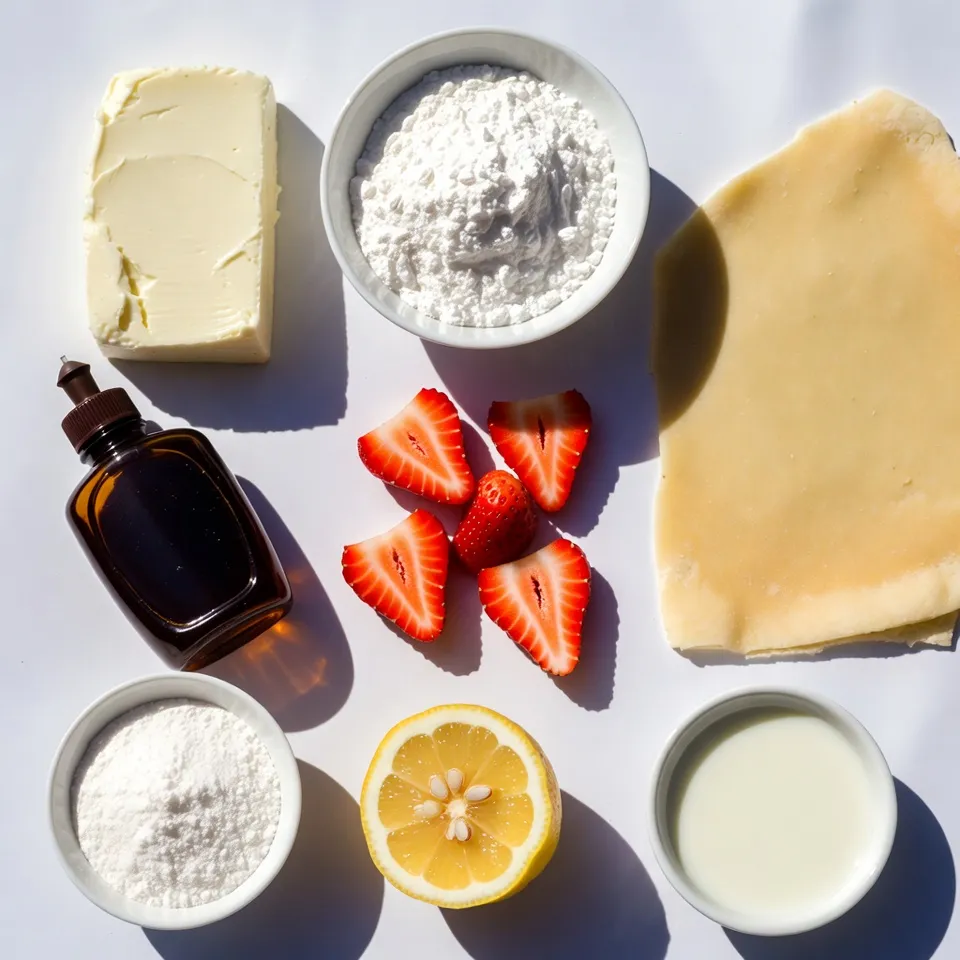 Each ingredient serves a purpose. Cream cheese gives a rich, smooth filling. Powdered sugar adds sweetness and helps blend the cream cheese. Vanilla extract enhances flavor, making every bite delightful. Puff pastry creates that flaky texture we love. Fresh strawberries bring vibrant color and taste. Cornstarch thickens the strawberry filling, while lemon juice brightens the flavor. The egg and milk make a shiny wash for a golden finish. Finally, a sprinkle of granulated sugar gives a crunchy topping.