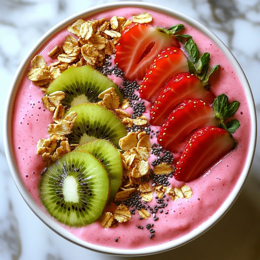 Once blended, pour the smoothie mixture into a bowl. This is where you can get creative! Sprinkle chia seeds on top for some crunch and nutrition. Then, add granola for texture. Lastly, decorate your bowl with more slices of strawberries and kiwi for a beautiful look. Top it off with fresh mint leaves for a pop of color. Serve it right away and enjoy every bite!