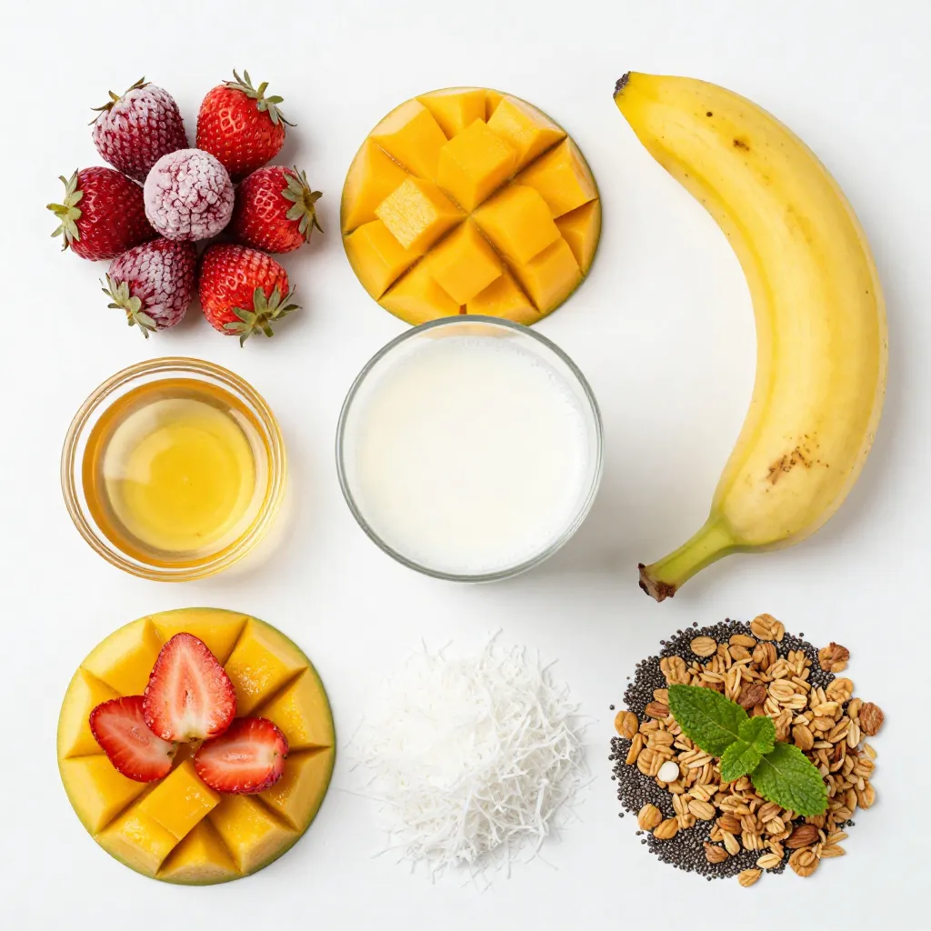 - 1 cup frozen strawberries - 1 cup frozen mango chunks - 1 ripe banana - 1 cup unsweetened almond milk - 1 tablespoon honey or maple syrup (optional) To make the best Strawberry Mango Smoothie Bowl, start with quality ingredients. Frozen strawberries give a sweet and tangy flavor. Frozen mango chunks add a smooth and creamy texture. A ripe banana ties everything together. It brings natural sweetness and a thick consistency. Unsweetened almond milk helps blend the fruits without added sugars. If you like a little extra sweetness, you can add honey or maple syrup. - Sliced fresh strawberries - Cubed mango - Granola - Chia seeds - Shredded coconut - Fresh mint leaves Toppings make your smoothie bowl special. Fresh fruit like sliced strawberries and cubed mango add color and taste. Granola gives a nice crunch. Chia seeds add nutrients and a fun texture. Shredded coconut brings a tropical feel. Finally, fresh mint leaves make the bowl look beautiful and refreshing. You can mix and match these toppings to suit your taste or mood! {{ingredient_image_1}} - Start by gathering your ingredients: frozen strawberries, frozen mango, ripe banana, and almond milk. - If you want it sweeter, grab honey or maple syrup. - Add all the frozen fruit and banana into your blender. - Pour in the almond milk. This helps everything mix well. - Blend on high until the mix is smooth and creamy. - If it feels too thick, add a little more almond milk. - Once ready, carefully pour the smoothie into a bowl. - Now comes the fun part! Use your toppings for an artistic display. - Start with sliced strawberries around the edge of the bowl. - Add cubed mango in the center for a bright pop of color. - Sprinkle granola for some crunch on top. - Add chia seeds and shredded coconut for texture. - Finish with fresh mint leaves for a touch of green. - Serve right away in chilled bowls for a refreshing treat. To get the right texture in your smoothie bowl, you can adjust the liquid. If your mix is too thick, add more almond milk. Blend again until smooth. If it's too runny, add a bit of frozen fruit. Frozen strawberries and mango chunks work best for thickening. Fresh fruit can make it runny, so use what you have wisely. Using frozen fruit gives your bowl a cold, creamy feel. It also adds natural sweetness. Fresh fruit can give flavor but may not thicken as well. So, I prefer frozen fruit in this recipe. It blends easier and creates a delightful texture. For sweetening your smoothie bowl, think about natural sweeteners. Honey and maple syrup are great choices. They blend well with fruit flavors. Start with a small amount, about one tablespoon. Always taste it and see if you want more. If you prefer to avoid refined sugars, stick with fruits. The ripe banana adds sweetness, too. You can adjust the sweetness to your taste. Mix until you find the right balance that makes you smile. Pro Tips Use Frozen Fruit: Using frozen strawberries and mangoes gives your smoothie bowl a thick and creamy texture without the need for ice. Experiment with Sweeteners: Adjust the sweetness of your smoothie bowl by using honey, maple syrup, or even a few dates for a natural sweetener. Layer Your Toppings: For a more visually appealing dish, layer your toppings instead of just sprinkling them on. This adds height and texture. Chill Your Bowls: Serving your smoothie bowl in chilled bowls keeps it refreshing and cool, enhancing the overall experience. {{image_2}} You can switch up the fruits in your smoothie bowl. Adding other berries like blueberries or raspberries brings new flavors. Mix strawberries with these berries for a berry blast! You can also try a tropical fruit blend. Pineapple, kiwi, or even passion fruit work well. The sweet and tart mix makes each bite exciting. If you need dairy-free options, almond milk is perfect. You can also use coconut milk for a richer taste. For a vegan version, skip honey and use maple syrup instead. It adds sweetness without animal products. If you want gluten-free toppings, you have many choices. Granola can be gluten-free, just check the label. Nuts and seeds add crunch and nutrition. Fresh fruit is always a safe topping. Enjoy your smoothie bowl, knowing it fits your diet! To store any leftover smoothie bowl, place it in an airtight container. This keeps it fresh and tasty. You can refrigerate it for up to two days. Before you eat, stir it well. If it seems thick, add a splash of almond milk. This will help bring back the creamy texture. If you want to freeze your smoothie bowl, pour it into an ice cube tray or a freezer-safe container. Smoothie cubes are great for quick smoothies later. They can stay fresh for about one month in the freezer. Just blend them with a bit of almond milk when you're ready to enjoy. You can prepare your smoothie bowl ahead of time. Just make the base and store it in the fridge. When you are ready to serve, add your toppings. This saves time and helps you enjoy a fresh meal. For a lovely presentation, use chilled bowls. This keeps your smoothie cold longer. Arrange the toppings in a colorful way. Use sliced strawberries, cubed mango, and a sprinkle of granola for a beautiful display. A drizzle of honey on top adds charm and sweetness. You can make your smoothie bowl thicker by using less liquid. Start with less almond milk. You can also add more frozen fruit. Frozen bananas work great for this. If it's still thin, blend in a bit of chia seeds. They soak up liquid and help thicken the mix. Yes, you can use fresh fruits instead of frozen. However, your smoothie bowl may be thinner. If you use fresh fruits, add ice cubes to make it cold and thick. Frozen fruit gives a creamier texture, so keep that in mind. You have many healthy topping options. Try using sliced kiwi, blueberries, or nuts. You can also add seeds like pumpkin or sunflower. For crunch, consider using homemade granola. Fresh herbs like basil can add a unique twist too. A smoothie bowl will stay fresh in the fridge for about o