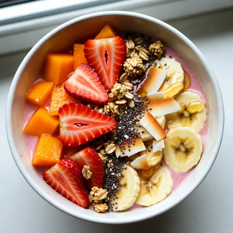 A refreshing and creamy smoothie bowl made with frozen strawberries, mango, and banana, topped with fresh fruits and granola.