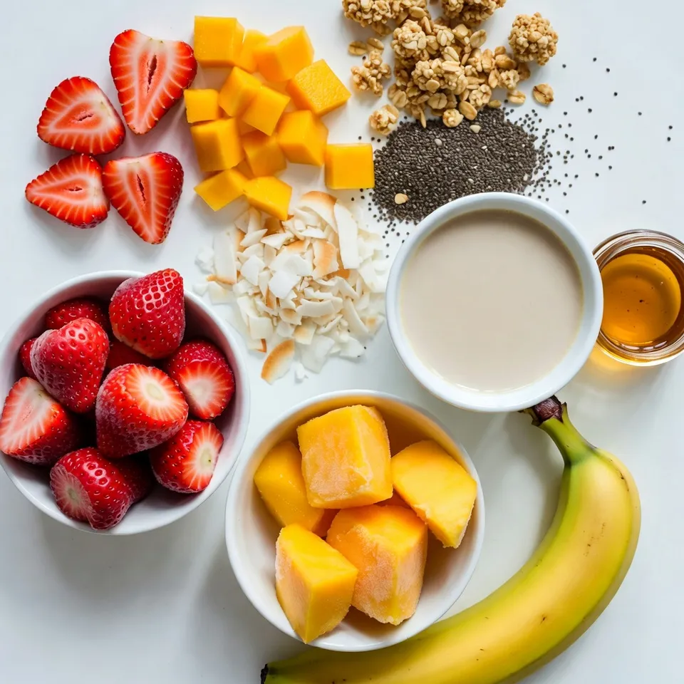 The main ingredients of this smoothie bowl are simple yet vibrant. Frozen strawberries and mangoes bring a burst of flavor. They also provide vitamins and antioxidants. A banana adds creaminess and natural sweetness. Almond milk makes the blend smooth. You can use any milk you like.