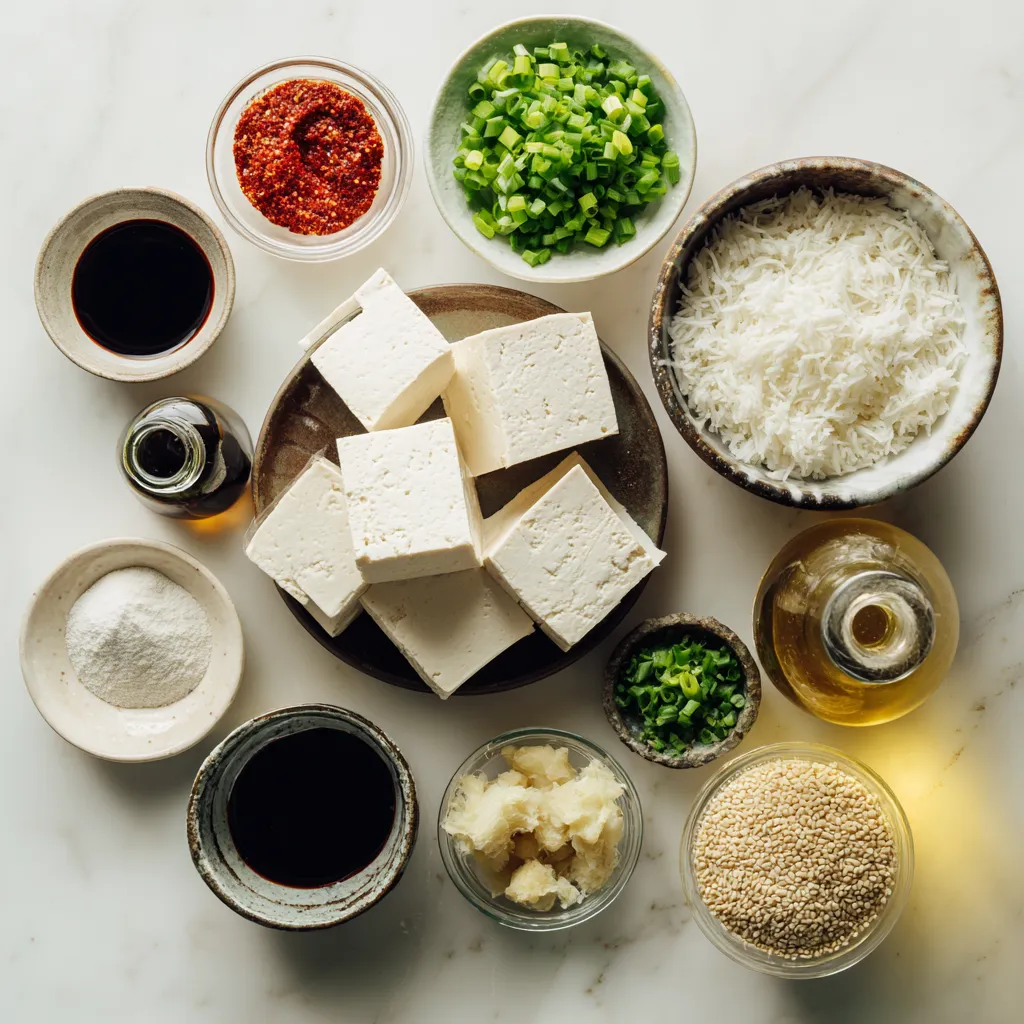 Soy sauce brings in a salty flavor, while sesame oil gives a rich, nutty taste. Rice vinegar adds acidity and balances the dish. Fresh ginger and garlic bring warmth and depth to the flavor profile. Cornstarch helps create a crispy coating on the tofu.