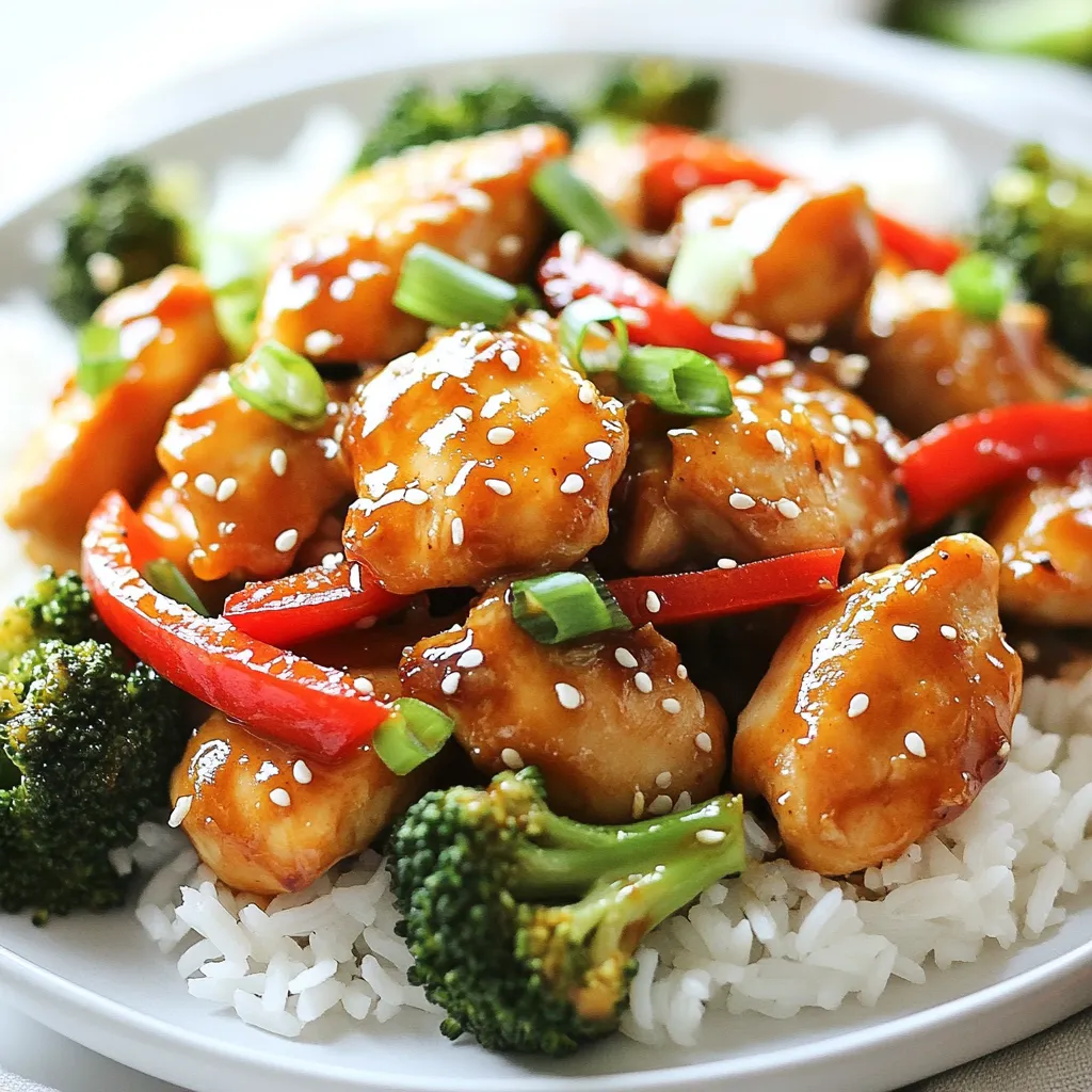 For garnishes, chopped green onions add onion flavor and crunch. Sesame seeds give a nutty touch. Serve the chicken over fluffy jasmine rice for a complete meal. This rice soaks up the delicious sauce well. Enjoy the vibrant colors and flavors on your plate!