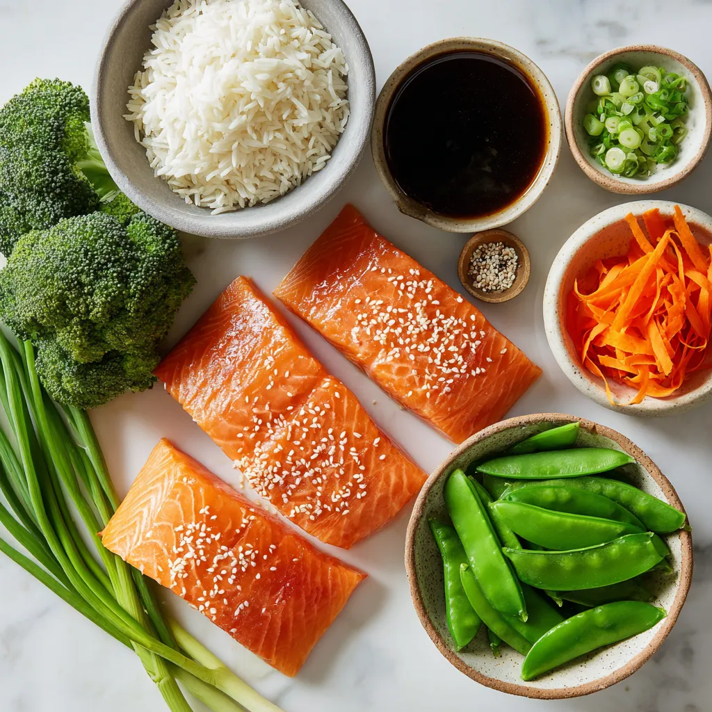To make Teriyaki Salmon Rice Bowls, you will need fresh and simple ingredients. Here’s what to gather: