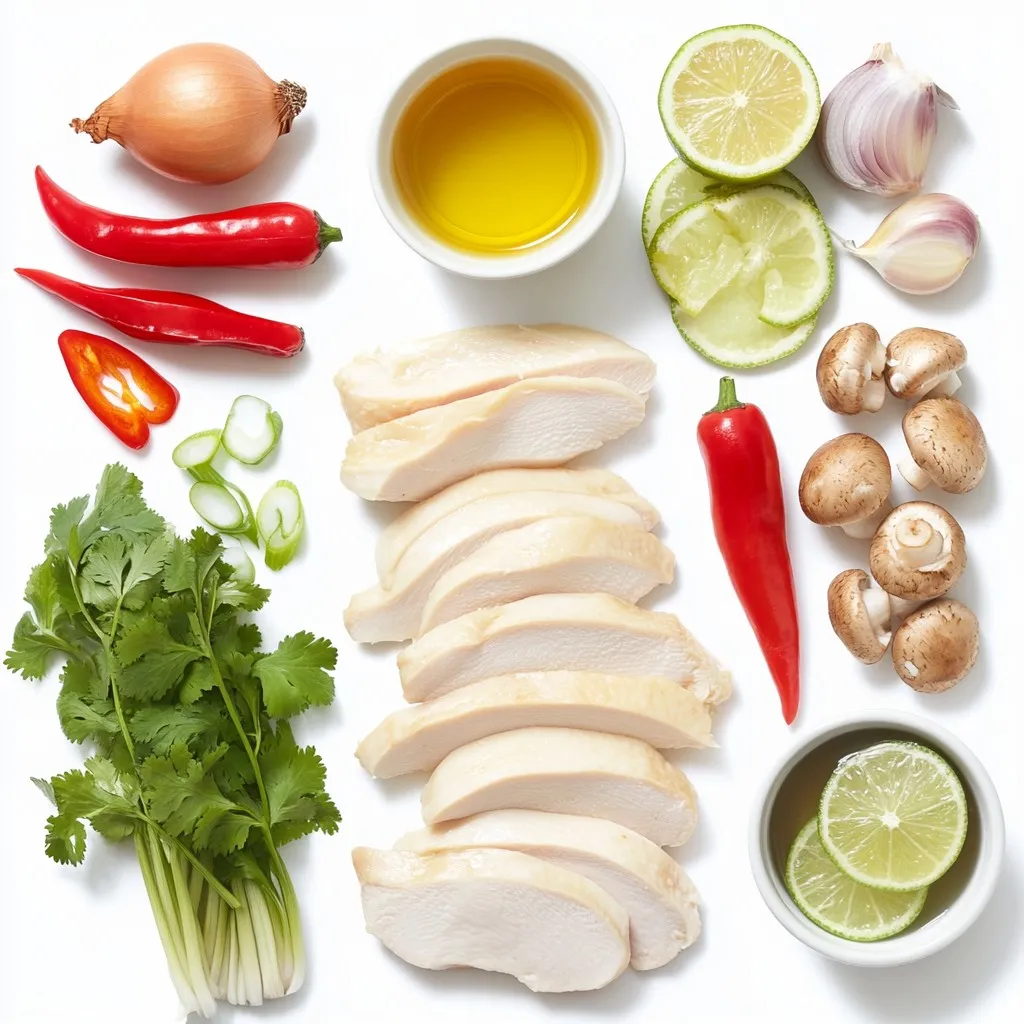 To start, gather all your ingredients. You need coconut oil, onion, garlic, ginger, lemongrass, chicken broth, coconut milk, chicken breast, red bell pepper, mushrooms, Thai chilies, fish sauce, lime juice, cilantro, and green onions. You can get everything ready in about 15 minutes.