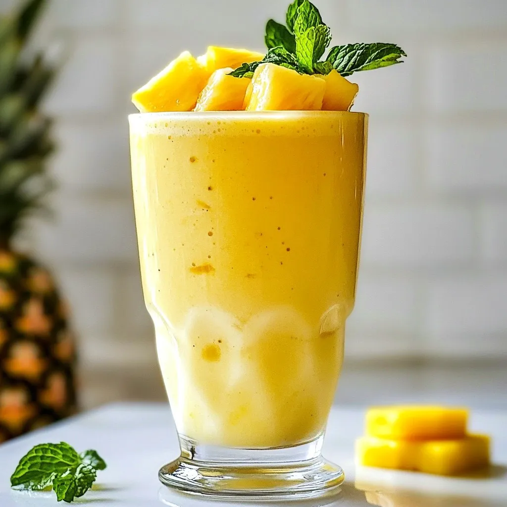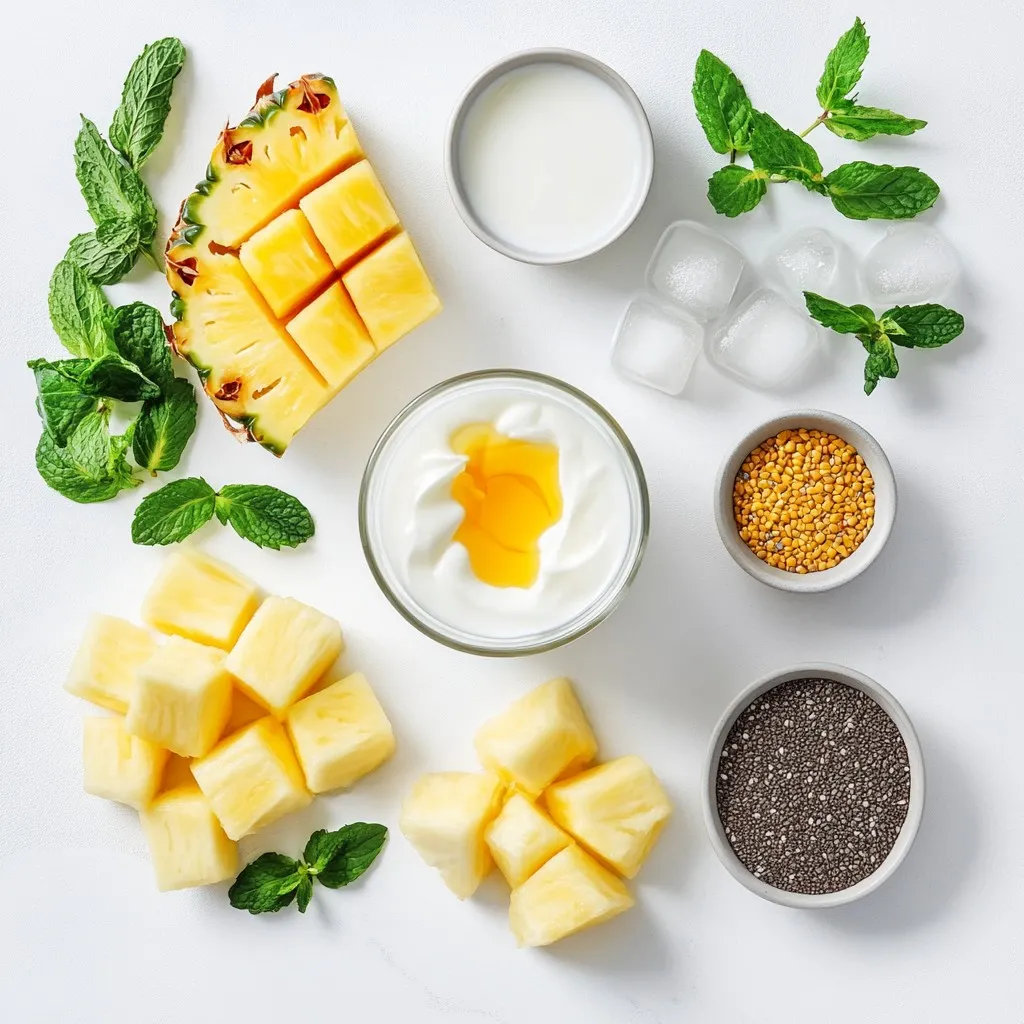 Pineapple is rich in vitamin C. It helps support your immune system. The banana adds potassium, which is great for your heart. Coconut milk provides healthy fats, keeping you full longer. Greek yogurt adds protein, making this smoothie a great meal option. Chia seeds boost fiber and omega-3s, promoting good digestion. Mint leaves not only add flavor but also have antioxidants. Together, these ingredients create a refreshing drink that nourishes your body and mind.