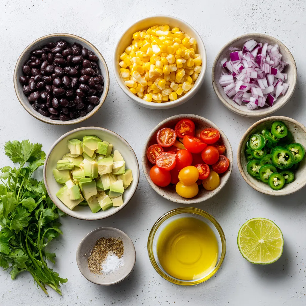 Start by gathering all your ingredients. You will need black beans, corn, bell pepper, onion, cherry tomatoes, avocado, and cilantro. If you want heat, grab a jalapeño. Rinse and drain the black beans first. If you use frozen corn, make sure it is thawed. Dice the red bell pepper and chop the red onion finely. Then, cut the cherry tomatoes in half. Lastly, dice the avocado and chop the cilantro.