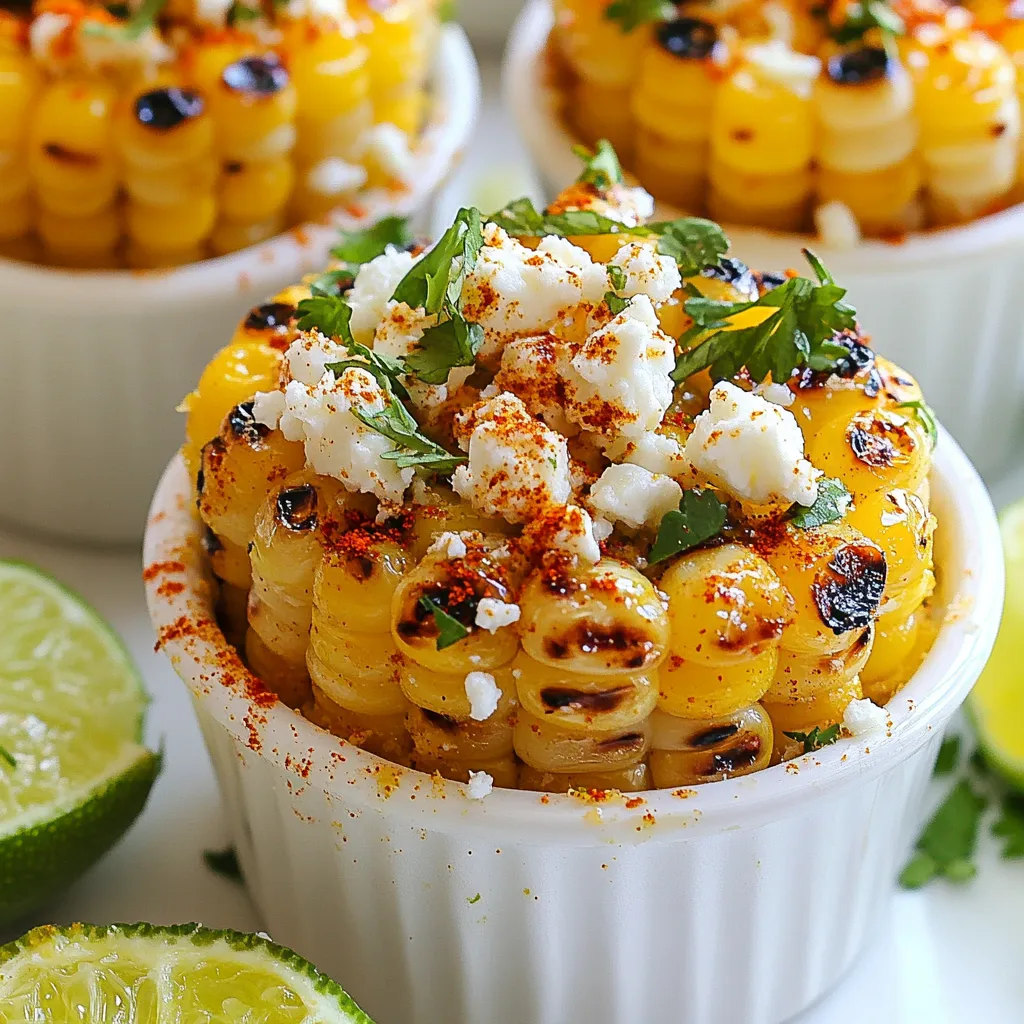 After grilling, let the corn cool slightly. Cut the kernels off the cob and put them in a mixing bowl. If you want, add crumbled feta cheese and chopped cilantro. Toss these ingredients gently to mix. Spoon the mixture into small cups or bowls for serving. Finally, garnish with extra cilantro and lime slices. This makes your dish look fresh and appealing.